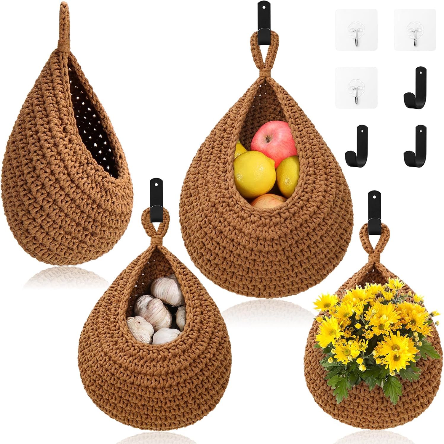 Hanging Fruit Baskets for Kitchen - 3 Pack Boho Wall Hanging Basket with 6 Pcs Strong Hooks, Handwoven Hanging Holder Teardrop Home Produce Basket for Fruits Vegetable Potato Onion Storage (Linen)