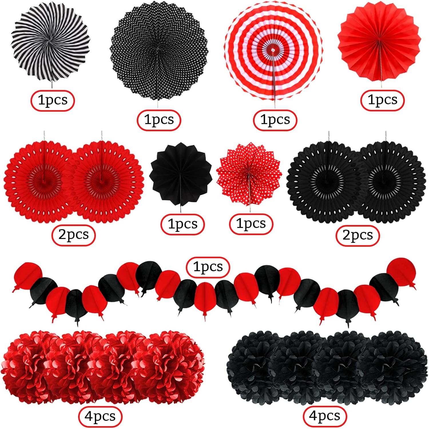 Red and Black Party Decorations, Papar Fans Pompoms Fans Garlands for Birthday Wedding Graduation Game Night Boy Girl Party Decorations