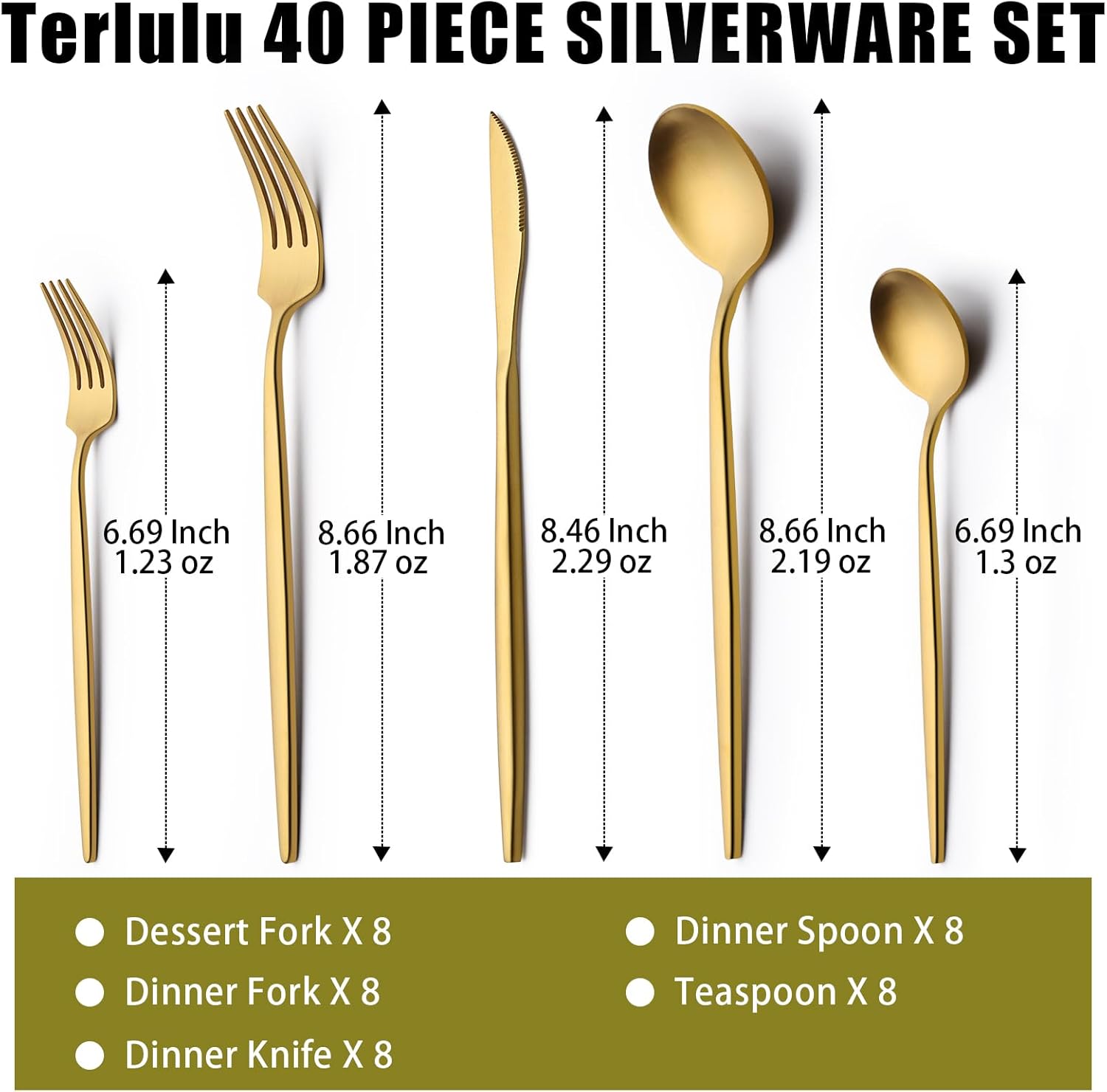 - ćSERVICE FOR 8ć Terlulu 40 piece gold silverware set for 8 includes 8 dinner forks, 8 dinner spoons, 8 dinner knives, 8 teaspoons, 8 salad/dessert forks in normal size, perfect for most families.