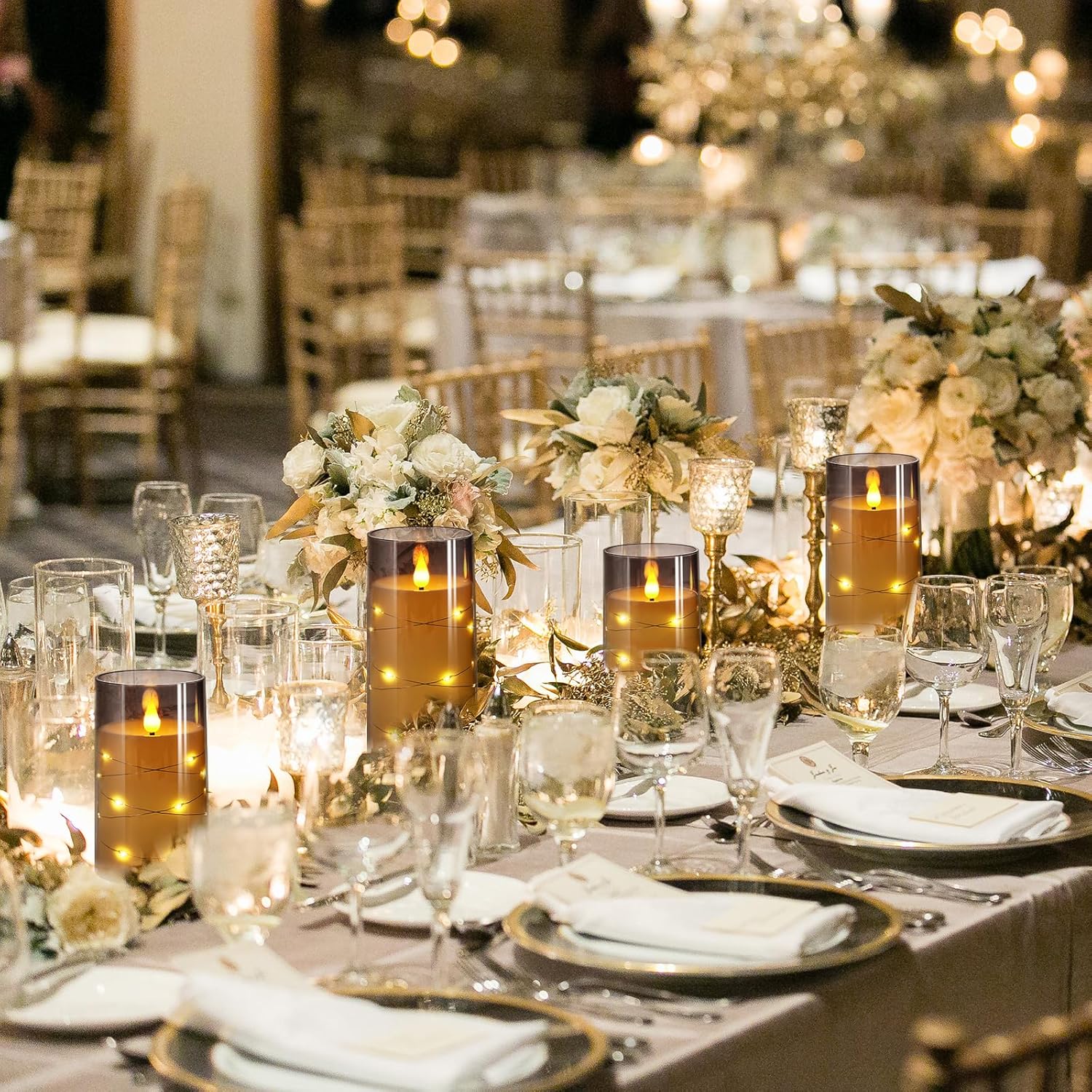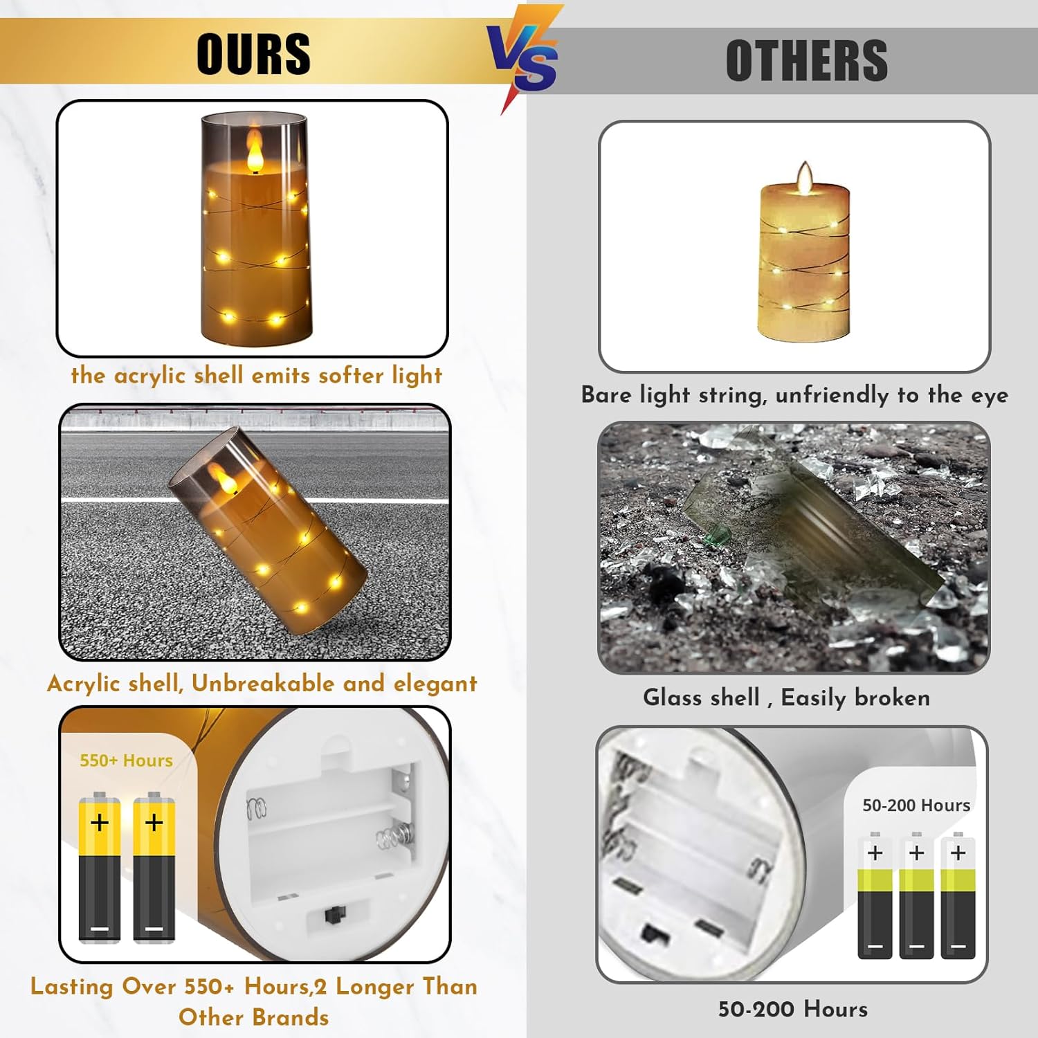 - Creative Embedded Starlight String Technology - Silver metal wire strung 16 warm little stars, winding around the middle flameless candle, this unique designed acrylic shell makes the LED pillar candle light shine softer and not dazzling. While the candle bright, the string of 12 to 16 LEDs are also lit. Placed on your bedside or dinner table, the extreme warm and romantic candlelight and starlight are full of classical and noble atmosphere, real and beauty