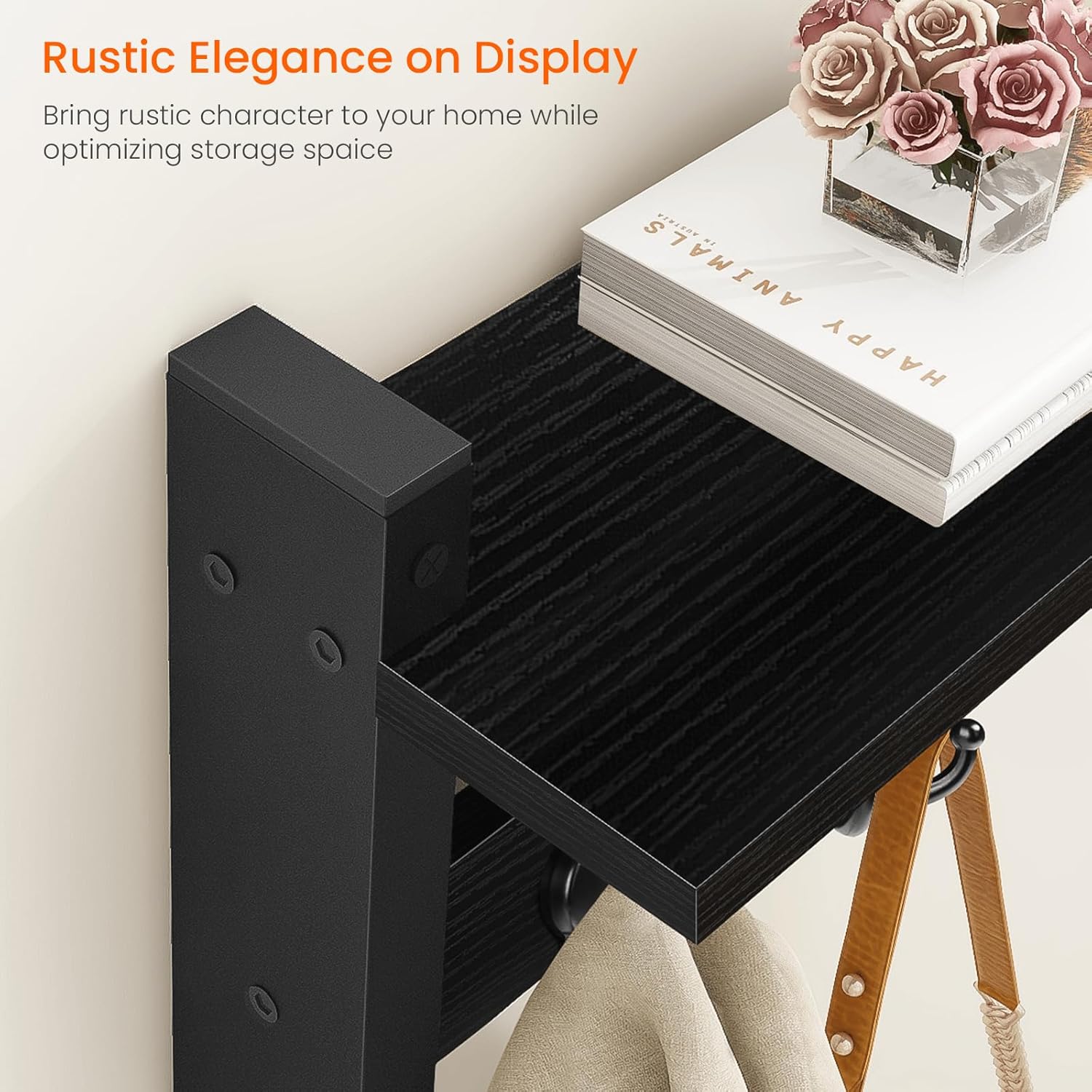 - EASY INSTALLATION: The coat rack comes with the hooks attached, no assembly required; Come with durable screws, anchors and easy-to-understand instruction, pre- drilled holes for mounting brackets, the wall shelf with hooks can be easily assembled and firmly put in the wall