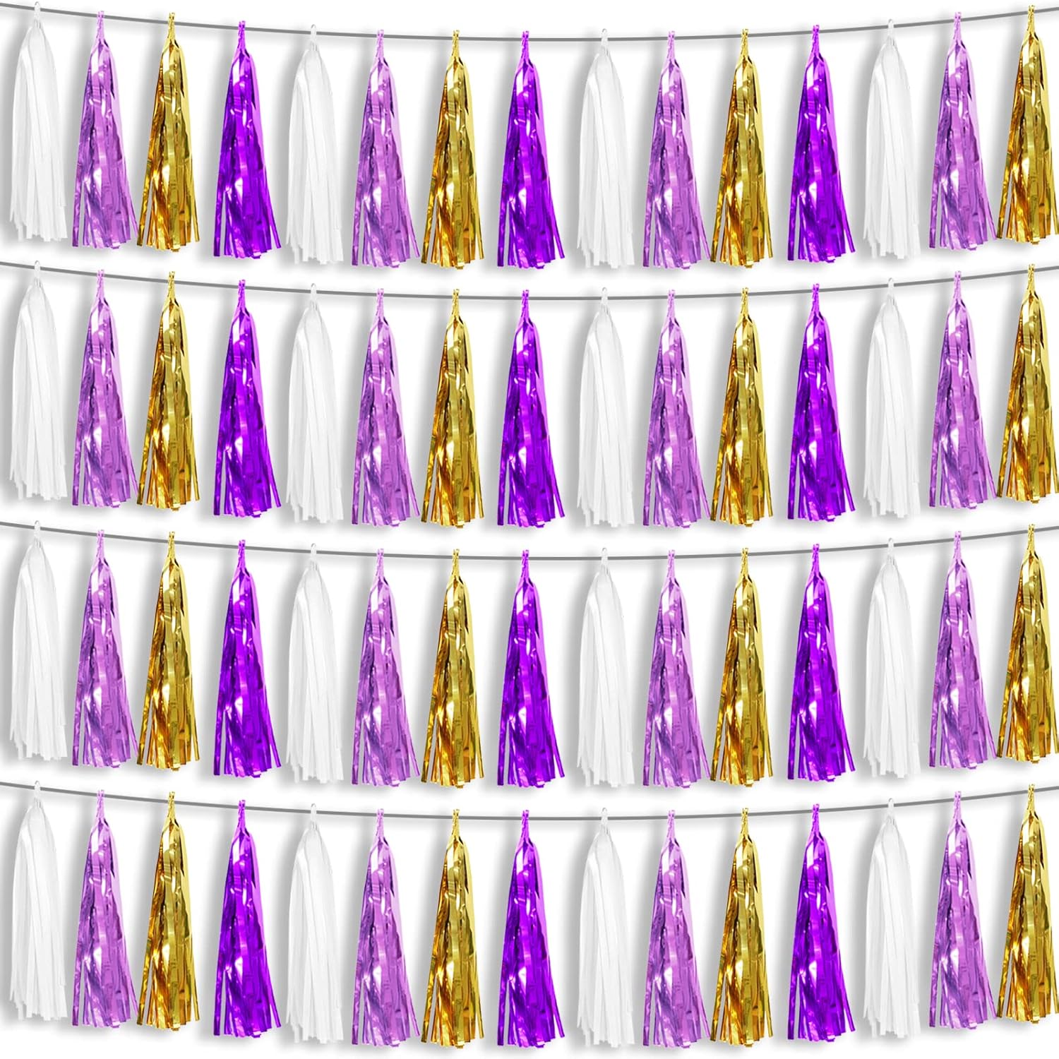 - 【White Light Purple Purple Gold Party Supplies Set】: The total length of the white light purple purple gold birthday tassels banner is 26.2 feet, divided into 4 strips, each 6.5 feet long. Each banner contains 15 tassels, and each tassel measures 14 inches, for birthday decorations many occasions, and so on