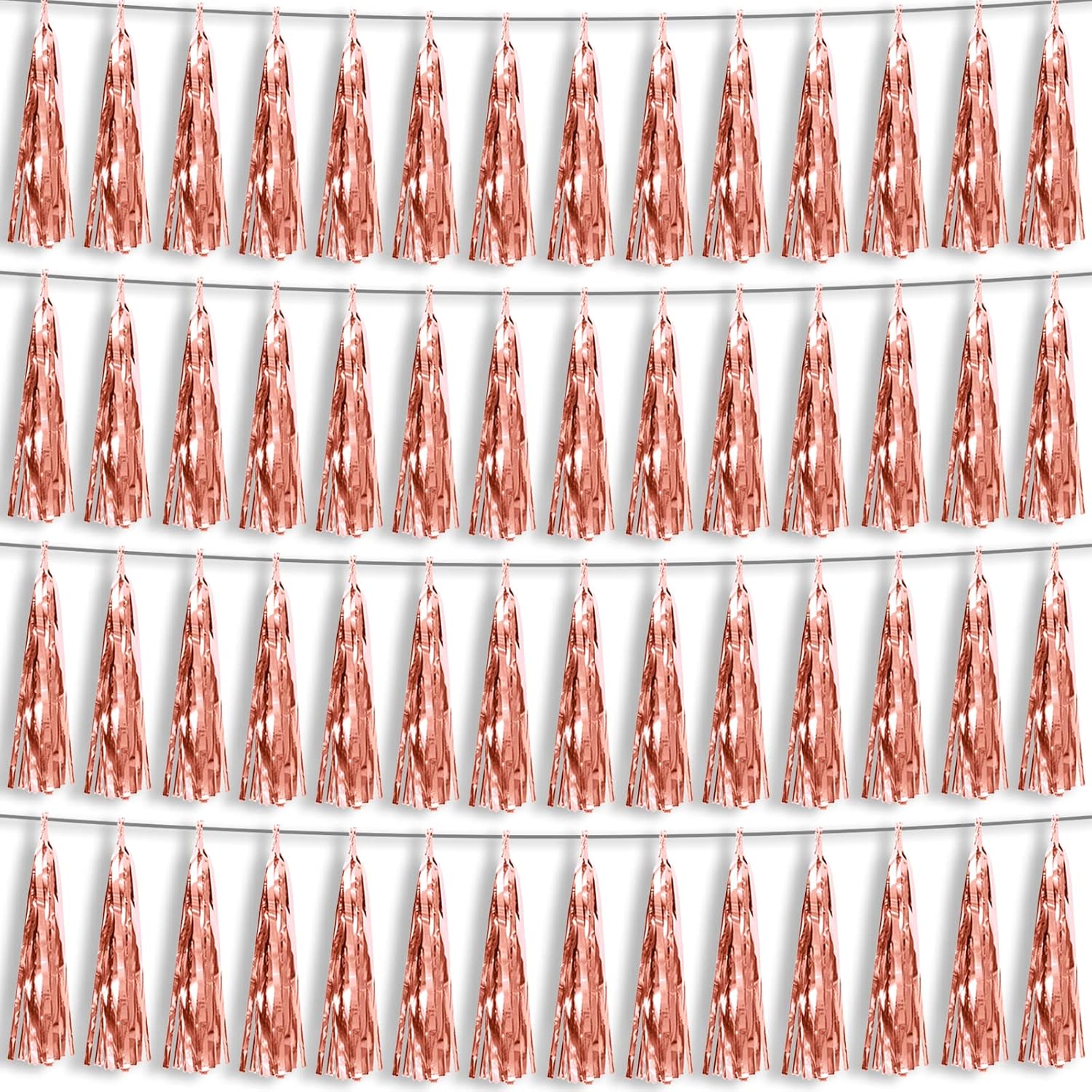 4P Rose Gold Foil Fringe Metallic Tassel Streamers Banner Tassel Garland for Parade Floats, Bachelorette, Wedding, Birthday, Halloween, Christmas, Bridal/Baby Shower Party Decorations