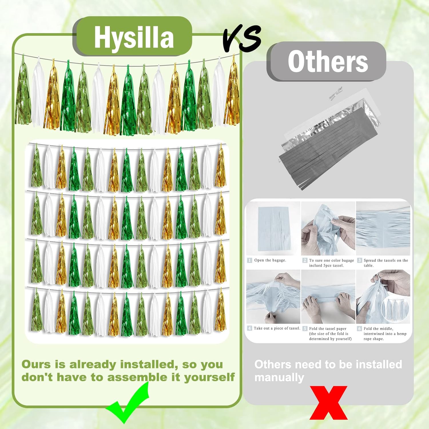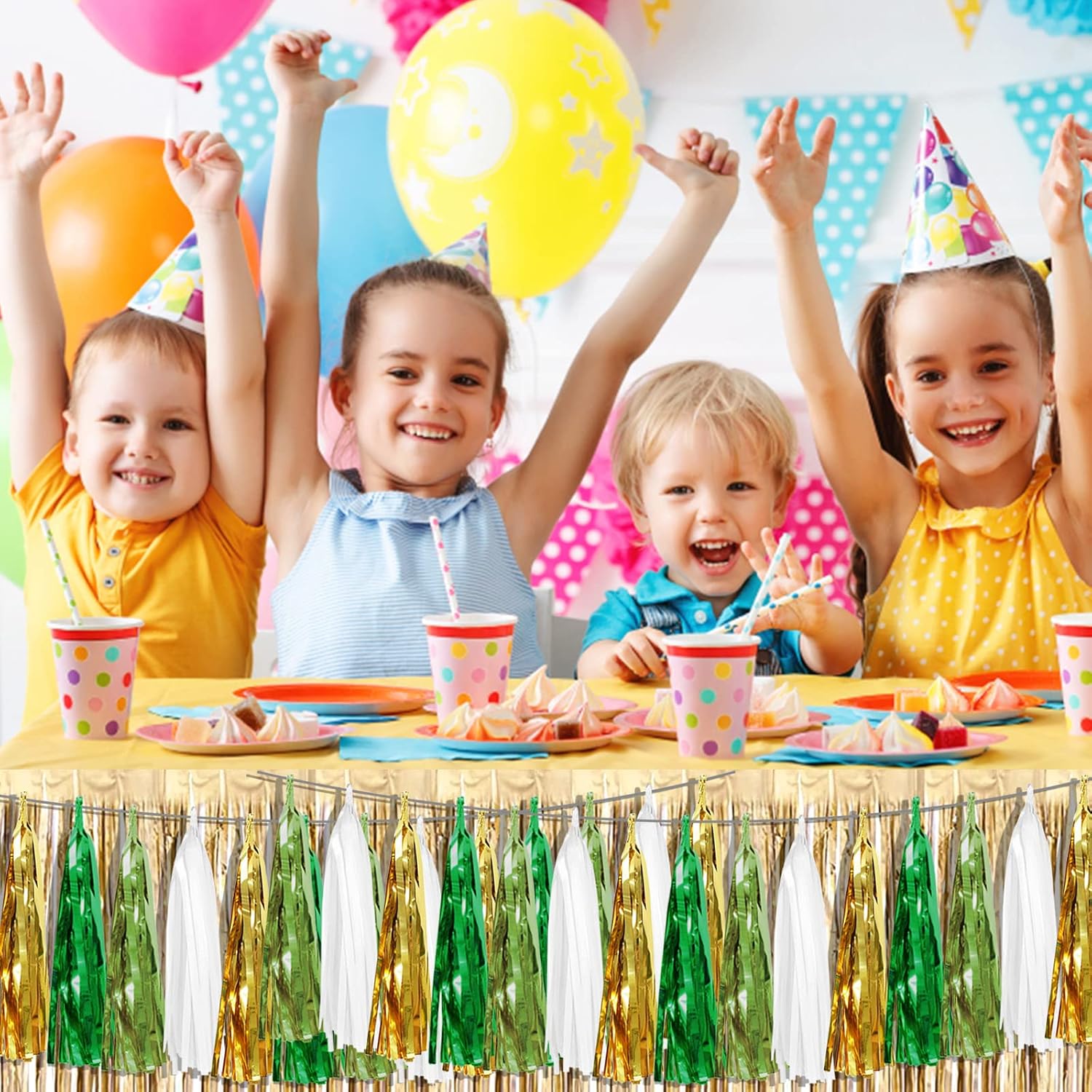 - 【Light Green White Gold Green Party Supplies Set】: The total length of the Light Green White Gold Green birthday tassels banner is 39.3 feet, divided into 4 strips, each 9.8 feet long. Each banner contains 15 tassels, and each tassel measures 14 inches, for birthday decorations many occasions, and so on