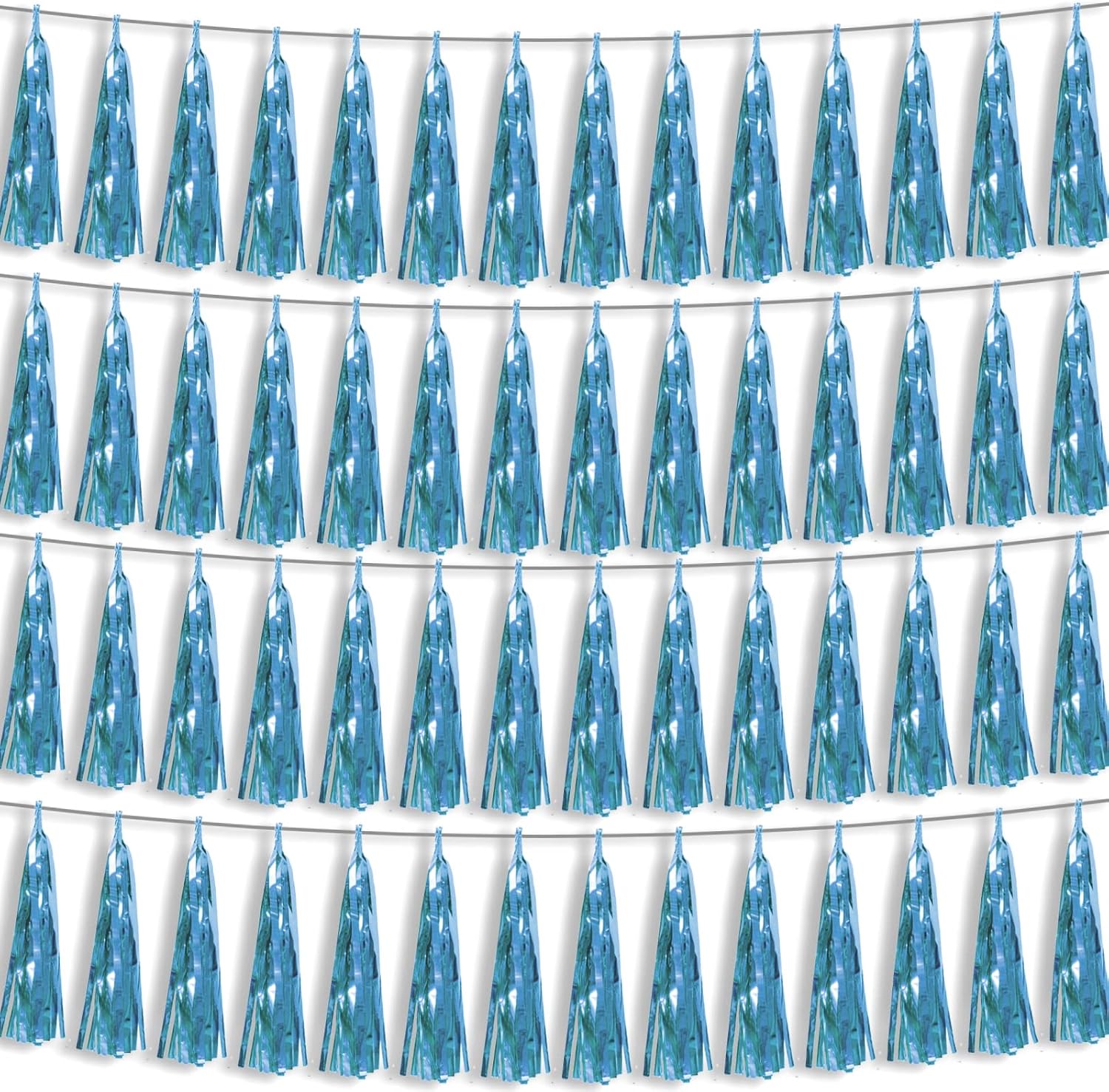 4P Light Blue Foil Fringe Metallic Streamers Banner Tassel Garland for Parade Floats, Bachelorette, Wedding, Birthday, Halloween, Christmas, Bridal/Baby Shower Party Decorations