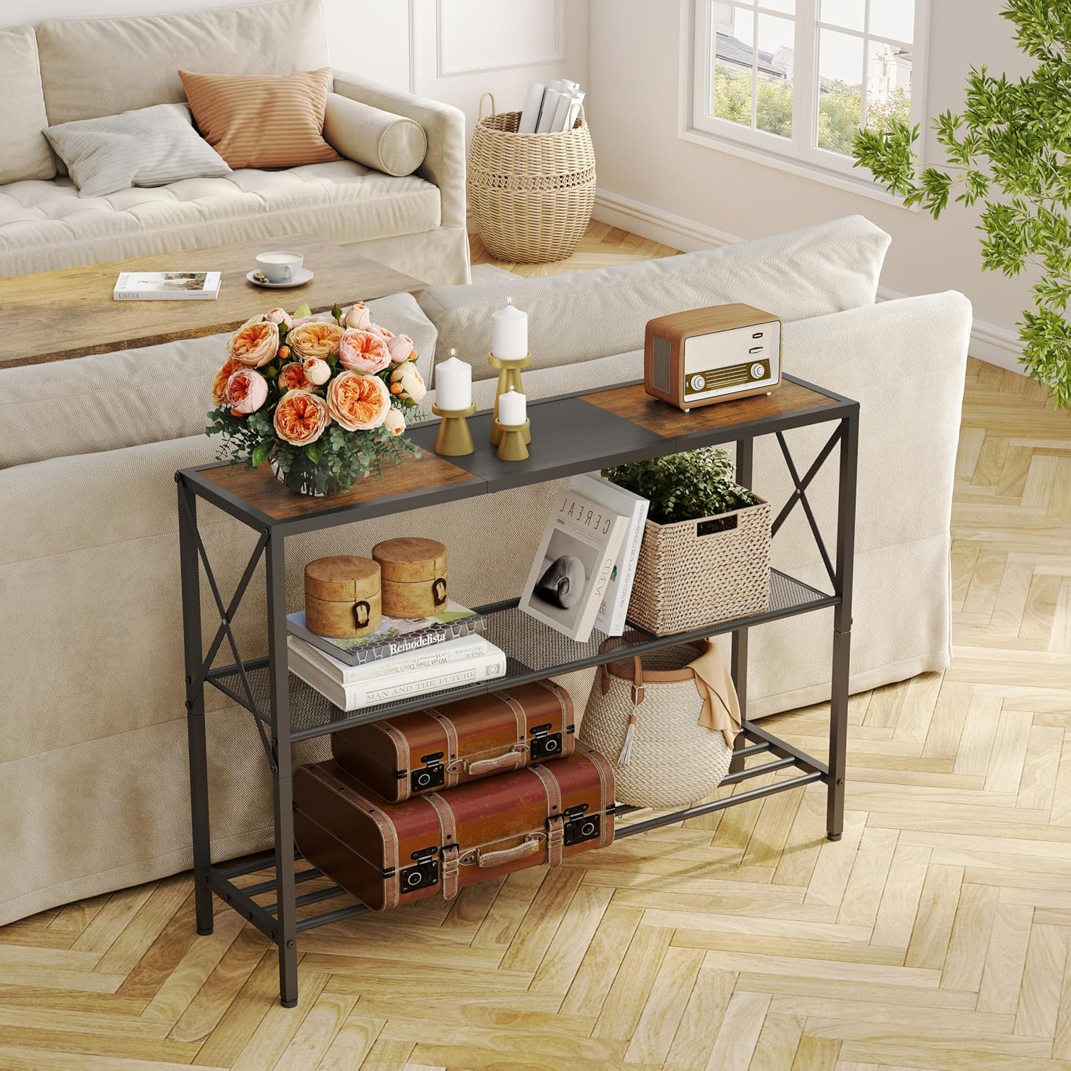- 【3-Tier Large Storage Space】42" x 12" long table top offers more storage space without occupying much space for various display options. 2-Tier shelves beneath the wooden shelf offer extra space for your books, plants, shoes, bags, or boxes to keep your essentials. The sofa entry table puts all daily essentials at your easiest reach.
