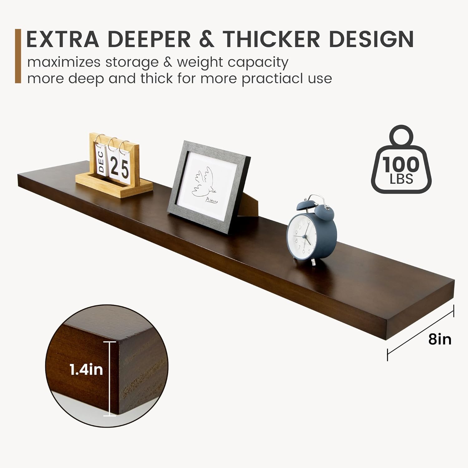 - Extra Deeper & Thicker for Storage - Each board measures 48"W x 8"D x 1.4"H. Extra deeper and thicker design in order to bring maximizes storage space and weight capacity, even hold up to 60 lb. This floating shelf taking up zero square feet, reduces clutter and highlights décor in compact spaces. It can help make full use of the empty wall, making it much more space-saving and making your room look larger and tidier.