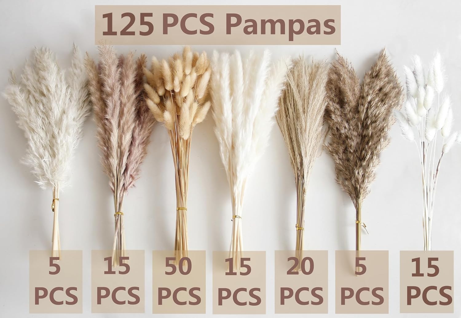 - 7 Varieties of Dried Florals: Our pampas grass bouquet bulk includes 50 nature bunny tails dried flowers, 15 White bunny tails dried flowers, 20 mini reed grass, 15 white pampas, 15 brown pampas, 5 white reeds, and 5 brown reeds, totaling 125 pieces. This quantity is more than sufficient.