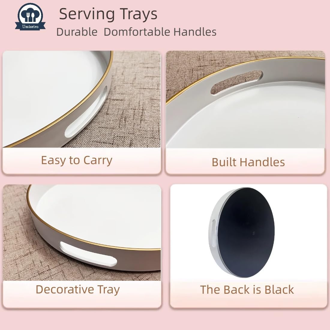 13" Round Decorative Tray, White Serving Tray with Handles, Plastic Coffee Table Tray for Ottoman, Living Room, Bathroom, Décor.