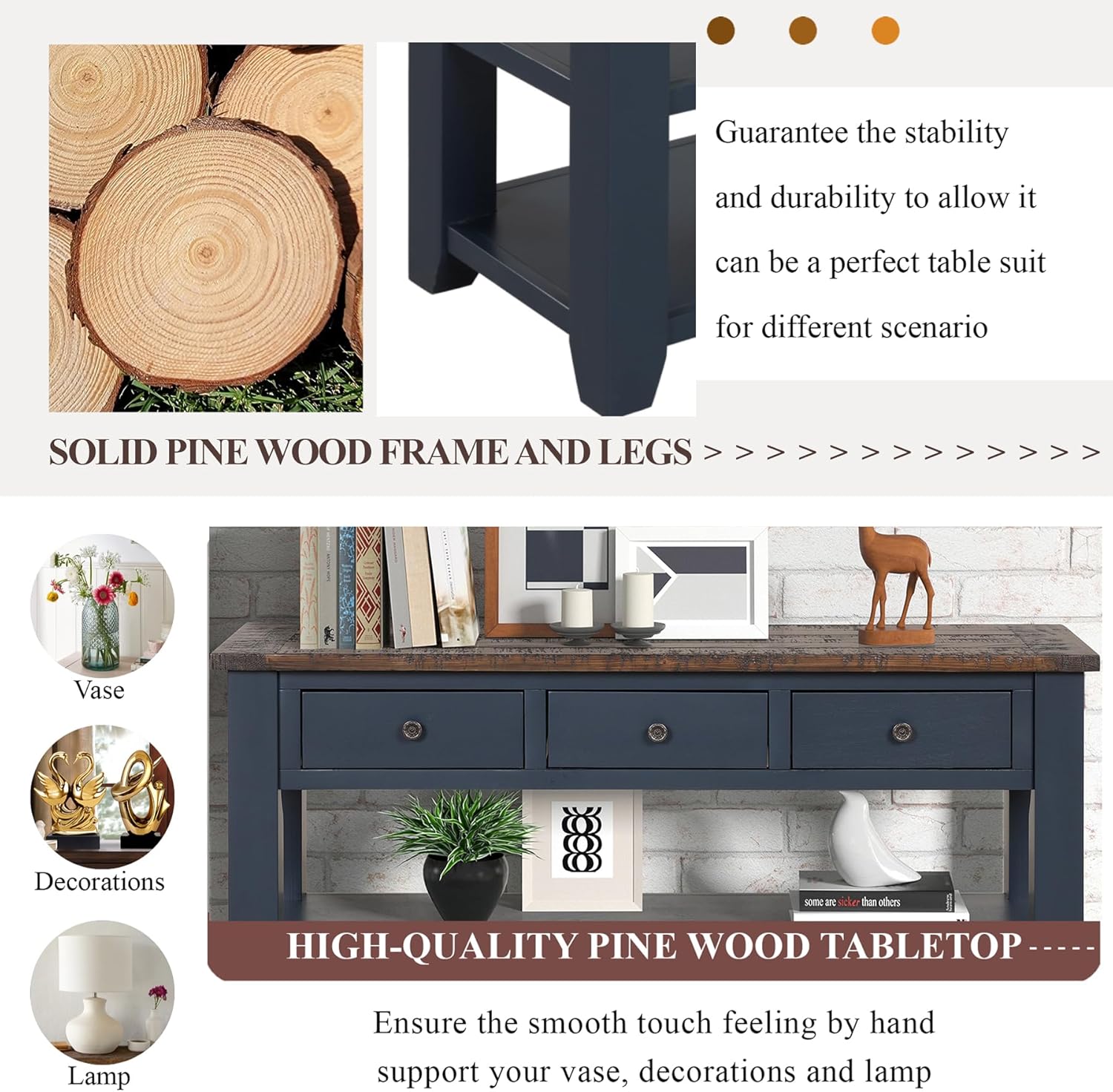 Solid Wood Console Table Sofa Table with Storage Drawers and Bottom Shelf Entryway Table for Entry Hallway Foyer Sofa Couch Table Fully Assembled (48.8" Blue)
