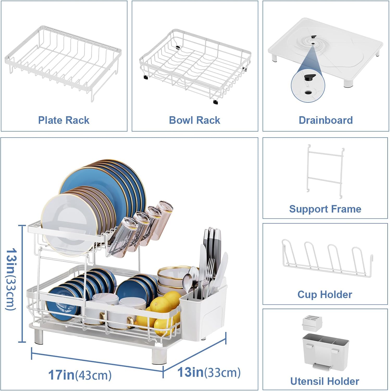 - 𝐋𝐚𝐫𝐠𝐞 𝐒𝐭𝐨𝐫𝐚𝐠𝐞 𝐂𝐚𝐩𝐚𝐜𝐢𝐭𝐲-Our dishes drying rack measures 16.9"d x 12.9"w x 12.9"h(43 d x 33w x 33 h cm),store 10 plates,16 bowls,12cups or glasses and lots of tableware, dish drainers for kitchen counter is enough for a family of 4.Recommended housewarming gifts for new house