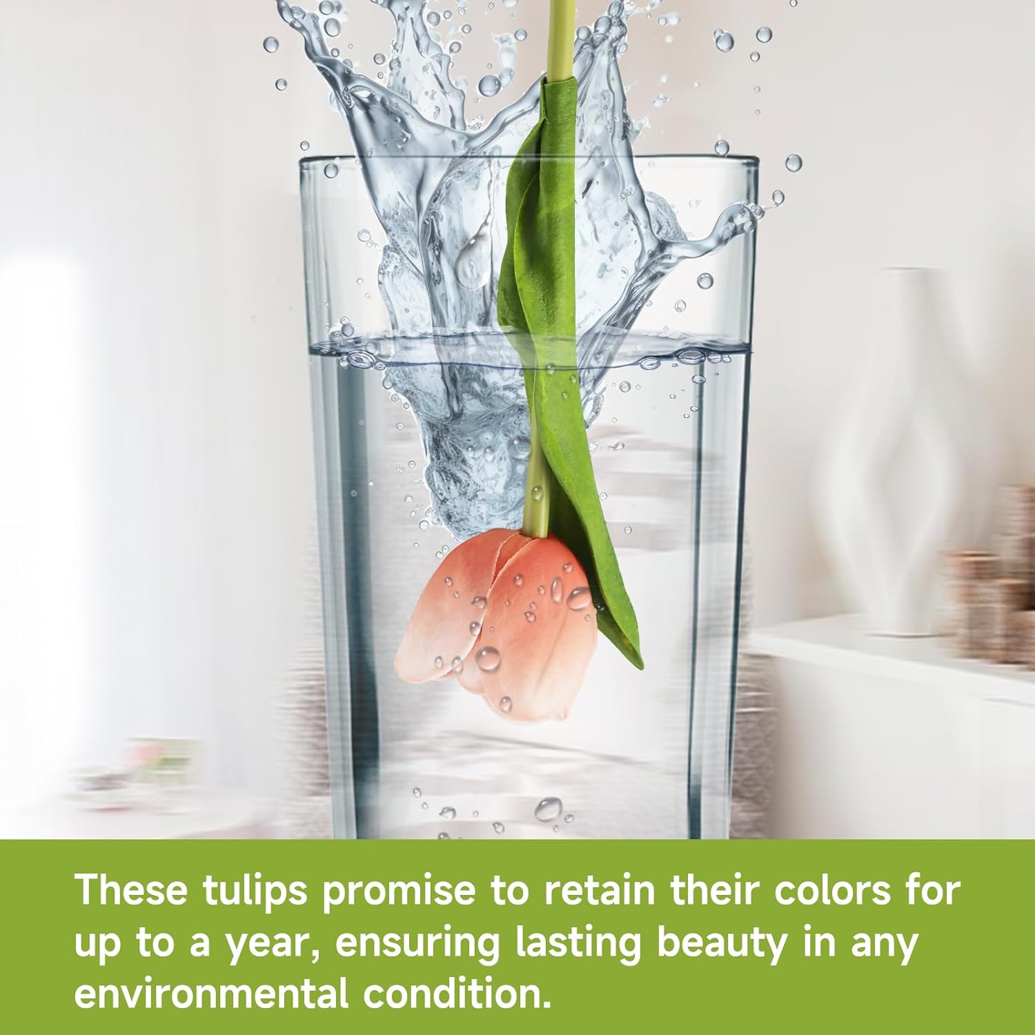 - Larger Flower Size: The size of the blooming flowers has been increased to 2.4 by 2.6 inch inches,making them more eye-catching and realistic,this means they're now even more of a focal point in a room,whether on a table or as part of a bouquet.The total length of the flower and stem is 13.5 inches,they are soft and easy to cut,you can easily resize them to fit your vase.The package includes 12pcs tulips.