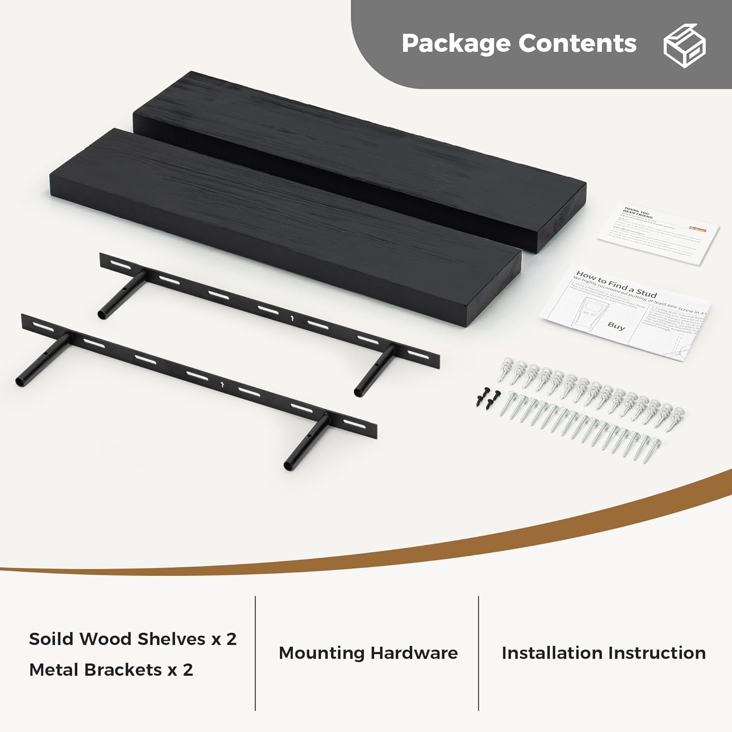 Fun Memories Handcrafted European Pine Floating Shelves - Natural Rustic Wooden Wall Shelf Set of 2-24 Inch Storage Shelf Display Shelf for Kitchen Bathroom Living Room Bedroom Farmhouse - Black