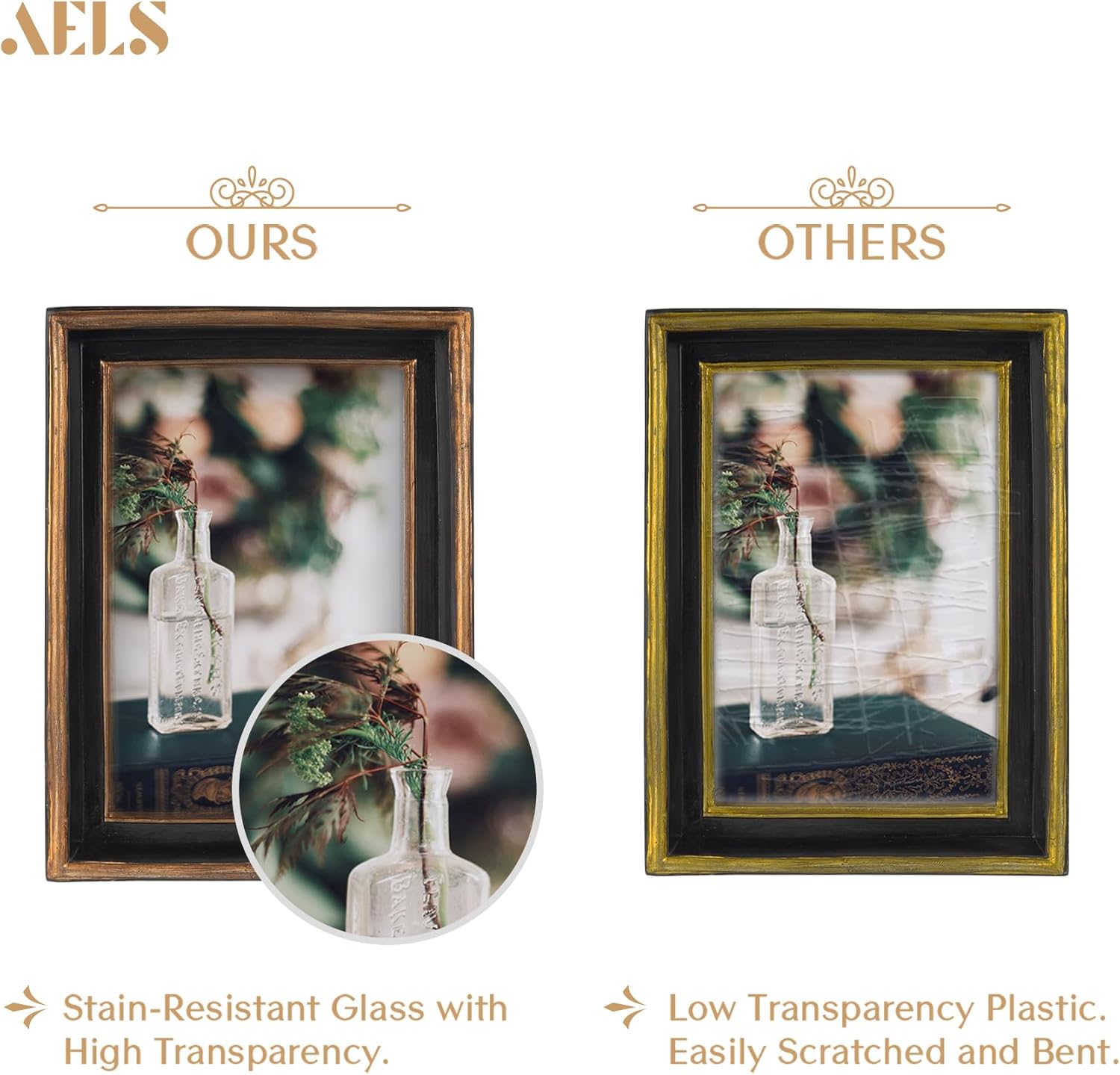 - [Elegant Decoration] It will be a perfect decorative photo frame for living room, bedroom, dining room, or bathroom. This picture frames will look great with any décor and perfectly fits any style of decoration, especially retro style.