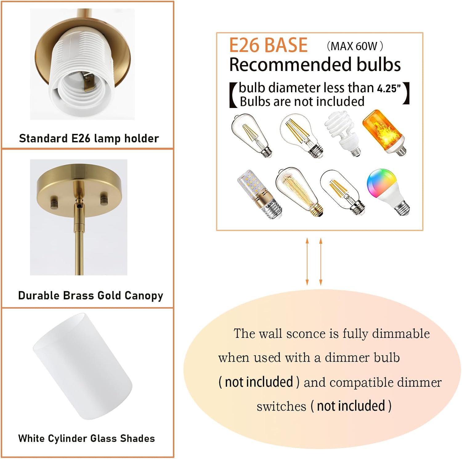 - 【3 Pack Modern Cylinder Pendant Light 】Crafted from sturdy metal , featuring brushed brass finish with traditional hand glassblowing white cylinder glass shade, BYOLIIMA gold chandelier no need to worry about getting oxidation and color fading. Simple and elegant,Perfect for mid-century decoration styles and combines the contemporary and retro style.