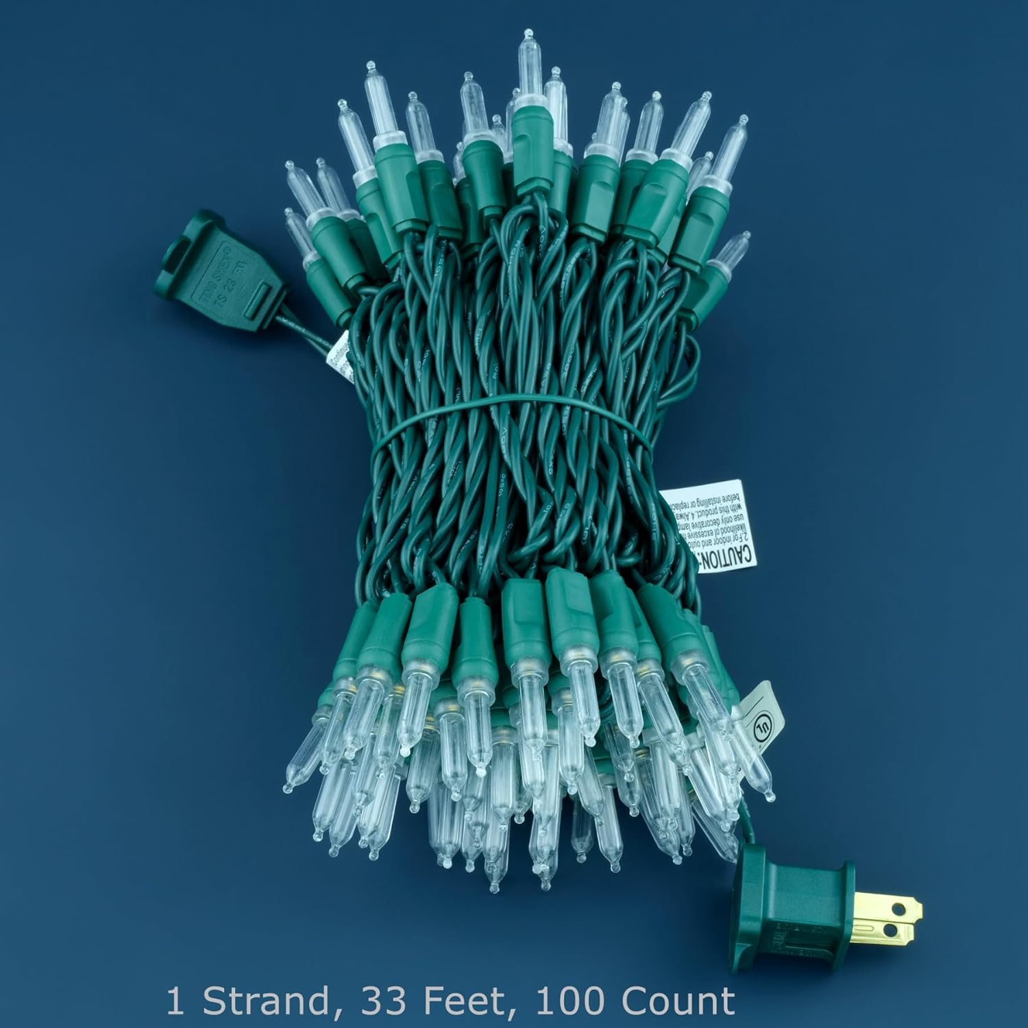 - SPECIFICATIONS ☀ Each pack contains 1 strands of one-piece string lights, total length 33 feet with 100 count warm white mini lights. 22 AWG green cord, 4" lead, 4" spacing, 4" tail.