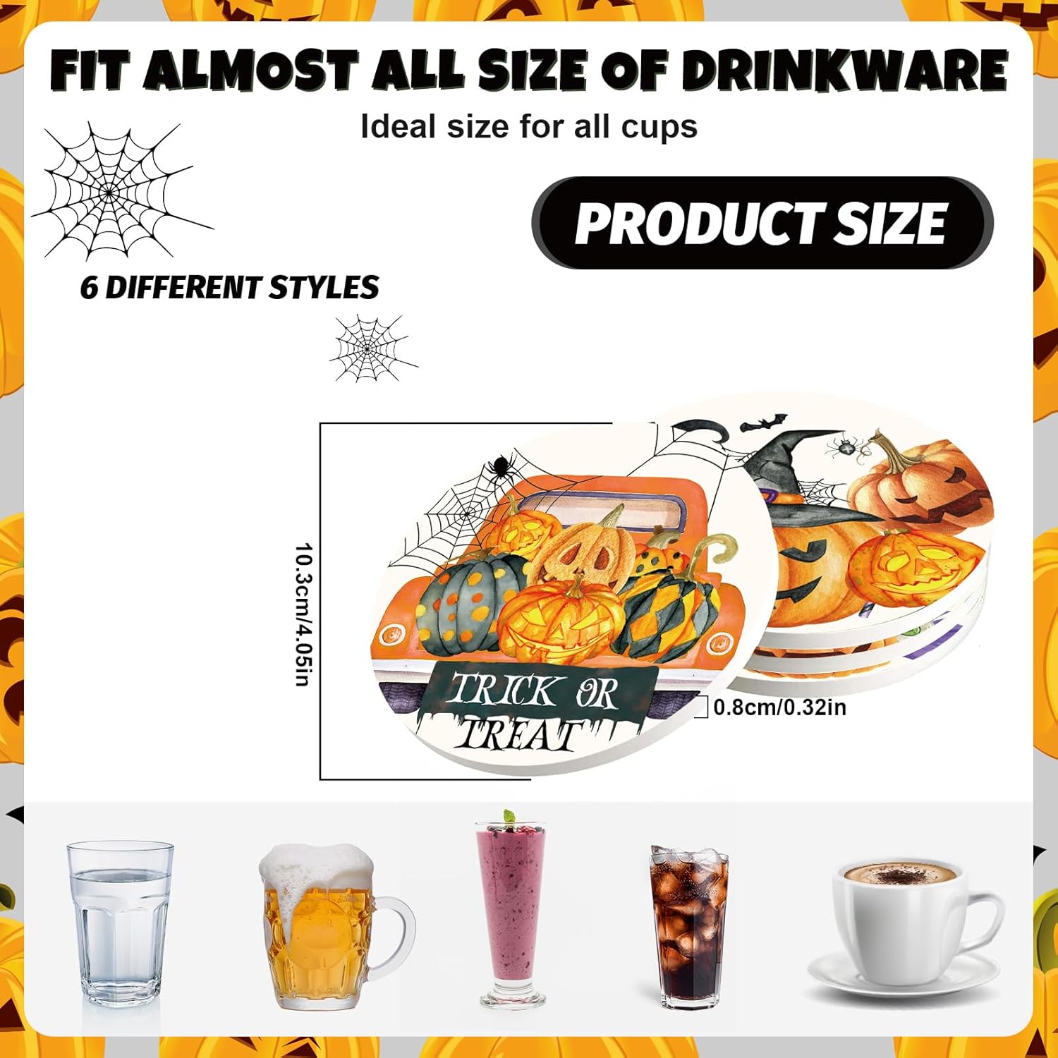 - Halloween Theme Design - Our ceramic coasters are patterned with pumpkins, gnomes and a truck, etc., unique and delicate, which will enhance fun atmosphere to your Halloween party.