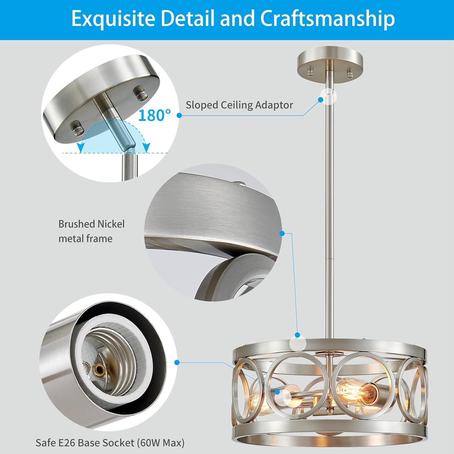 - [EXQUISITE DESIGN]: Make your dining room look stunning with this farmhouse chandelier. Its unique open drum frame, with brushed nickel finish, adds a touch of rustic charm to any decor style. Unlike plastic chandeliers, this 1 is made of durable metal and is sure to impress.