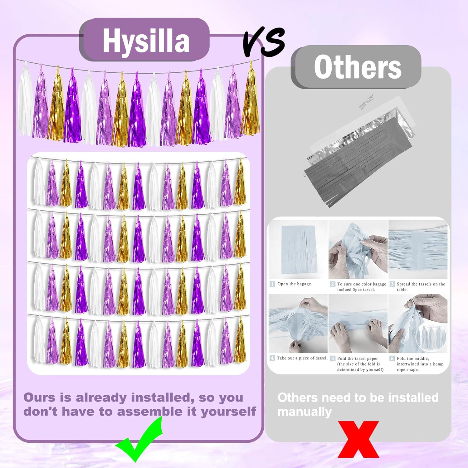 - 【White Light Purple Purple Gold Party Supplies Set】: The total length of the white light purple purple gold birthday tassels banner is 29.5 feet 45tassels, divided into 3 strips, each 9.8 feet long. Each banner contains 15 tassels, and each tassel measures 14 inches, for birthday decorations many occasions, and so on