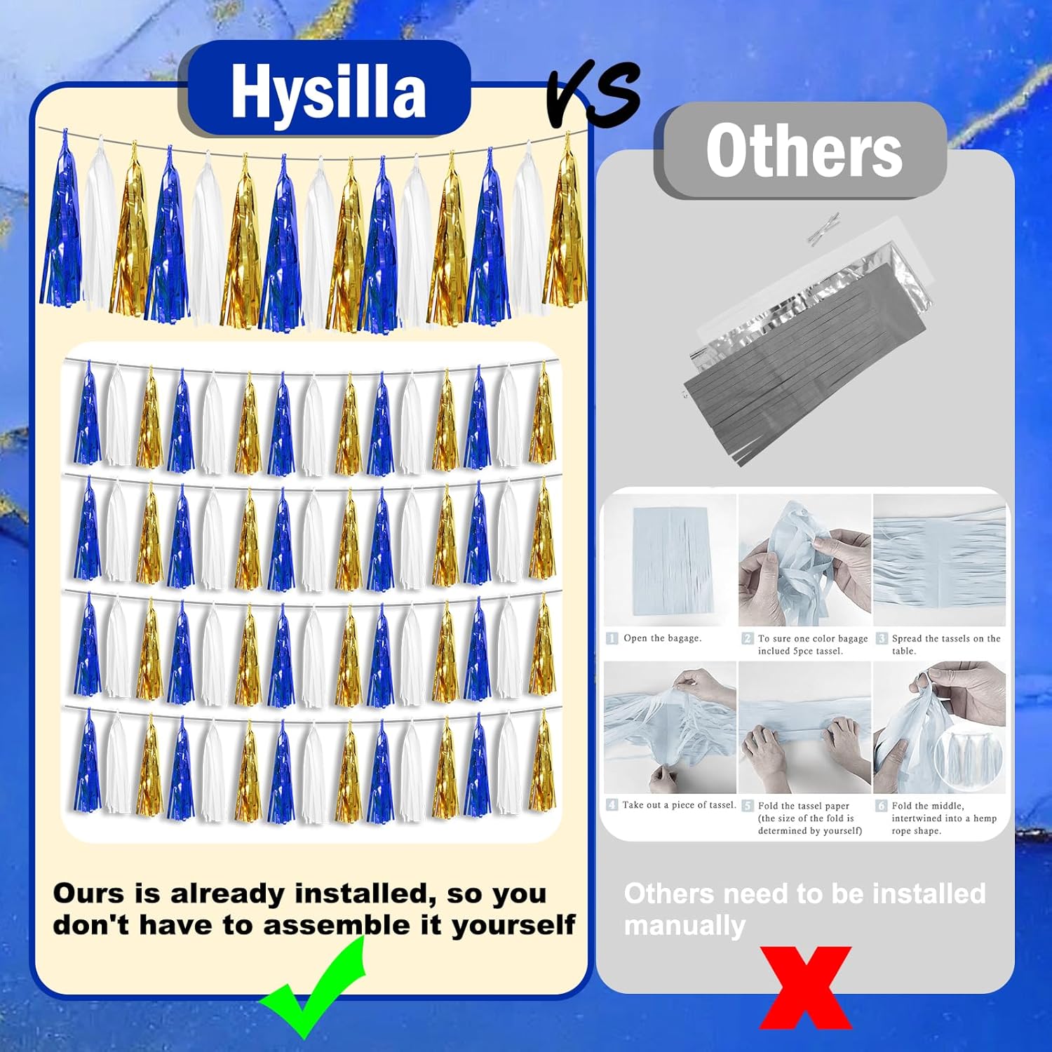- 【Navy Blue White Gold Party Supplies Set】: The total length of the navy blue white gold birthday tassels banner is 29.5 feet 45tassels, divided into 3 strips, each 9.8 feet long. Each banner contains 15 tassels, and each tassel measures 14 inches, for birthday decorations many occasions, and so on