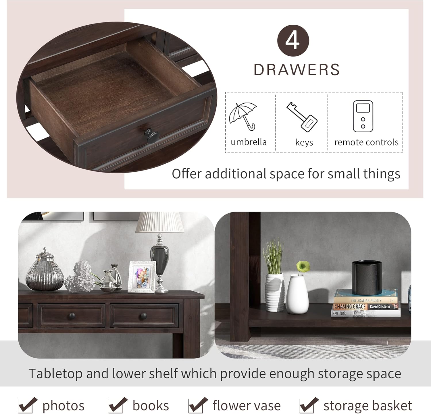 - š³ćConsole Table with Drawers and ShelvesćThis sofa table has drawers and bottom partitions to give you plenty of storage space to sort and store different items. Perfect for displaying decorations such as paintings, photos, flowers and other things you can think of
