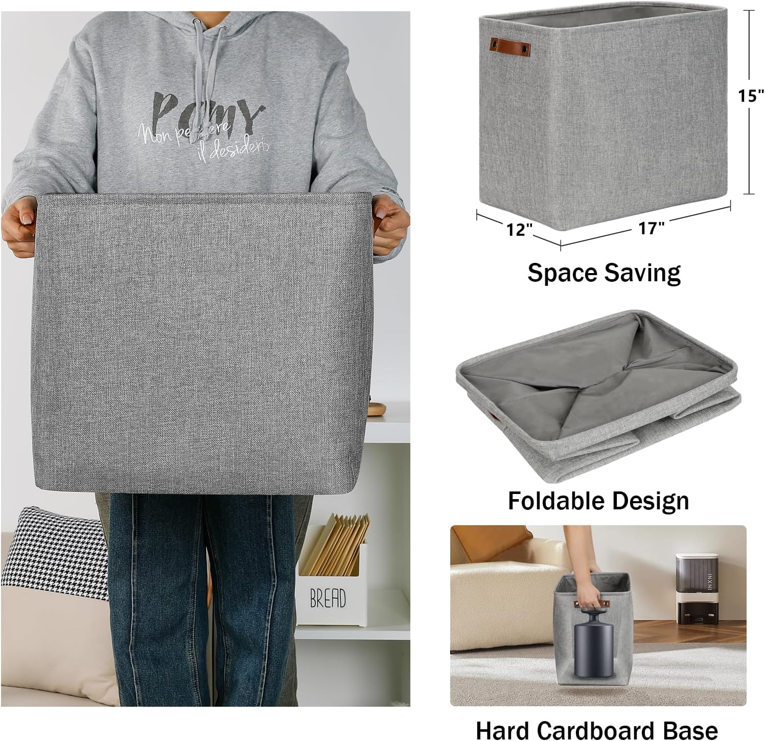 - 【Unique Design & Modern & Decorative】Set of 3 large storage baskets, dimensions(each): 17(L) x 12(W) x 15(H) inches. Collapsible storage baskets bring you organizing convenience and a sweet home. Great for socks, underwear, books, magazines, toys, baby clothes, pet products, wipes, towels, decorations, office supplies, DVDs, and gifts. The fabric baskets with neutral colors can match a lot of home styles - keeping your home nice and tidy.