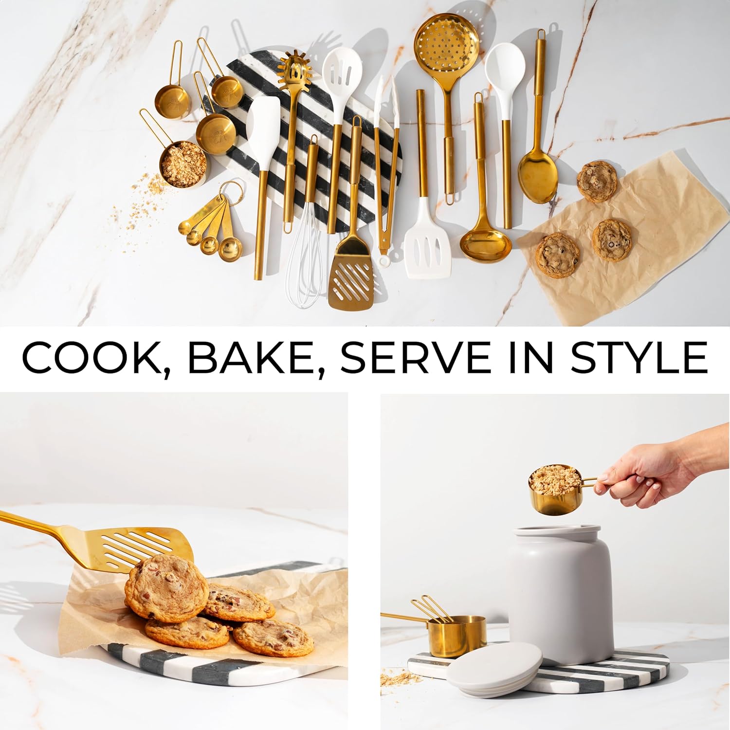 - ✔ ADD GLAMOR TO YOUR KITCHEN WITH THIS COMPLETE GOLD KITCHEN UTENSILS - instantly elevate your cooking and baking experience by adding this 19-piece set of gold stainless steel cooking utensils, white kitchen utensils, & gold measuring cups and spoons. Contents include a gold spoon, pasta serving fork, slotted gold spatula, kitchen skimmer, gold ladle, silicone spatula, slotted silicone turner, basting spoon, silicone whisk, gold tongs, gold measuring cups, and gold measuring spoons