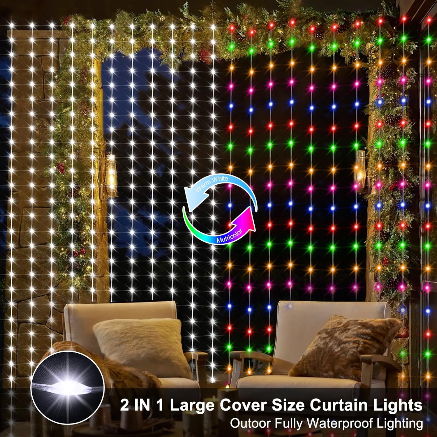 - IP68 Fully Waterproof: 100% waterproof curtain lights are designed to withstand any weather conditions, making them perfect for outdoor decoration like backyard, patio, deck, pergola, tents, pavilions or garden. No need to worry about the rain or snow affecting their performance(The plug adapter needs to keep dry)