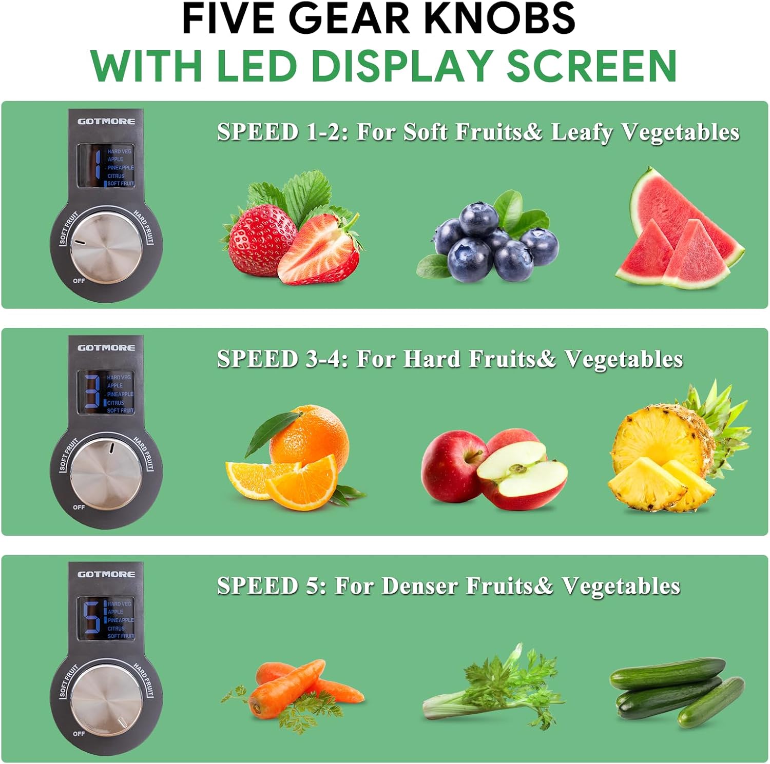 - 【5 Speed Modes and Anti-Drip Funtion】 Powerful motor with a maximum speed of 23500R/min (Max). Includes 5 speed modes, low speed for soft fruits and vegetables like oranges, apple, tomato, etc; High speed for hard food like carrots, celery, etc. Design with anti-drip function, no need to worry about juice spilling everywhere.