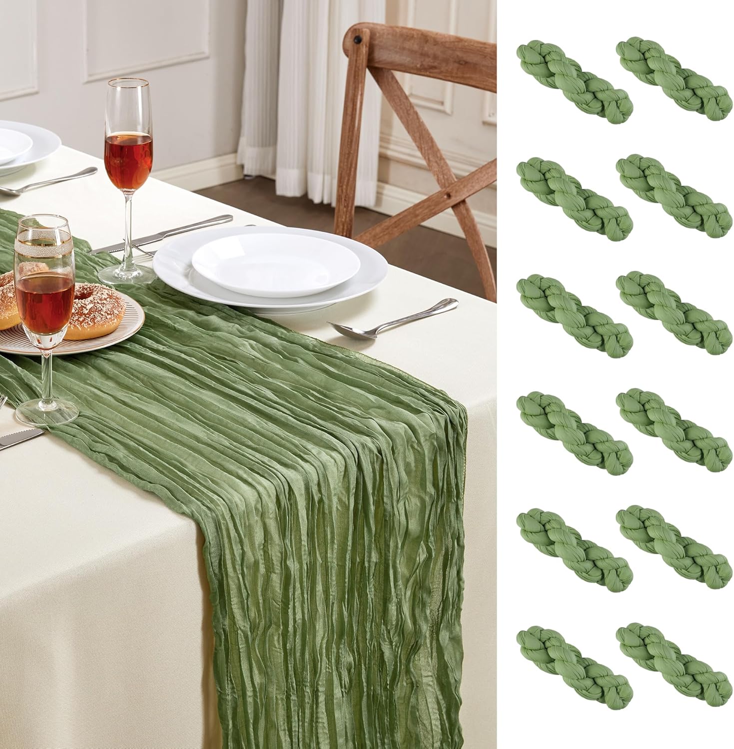- PACKAGE INCLUDED: You will receive 12 pieces of sage green cheesecloth table runners. Elegant and beautiful design, exquisite workmanship. Product size: Each boho table runner is 35 x 120 inches. Enough to cover rectangles and round tables, as well as long tables that are stitched together. It can even be used to belt chairs decorate napkins, background curtains. Round or square tables for 8-10 people, perfect for romantic and elegant party events