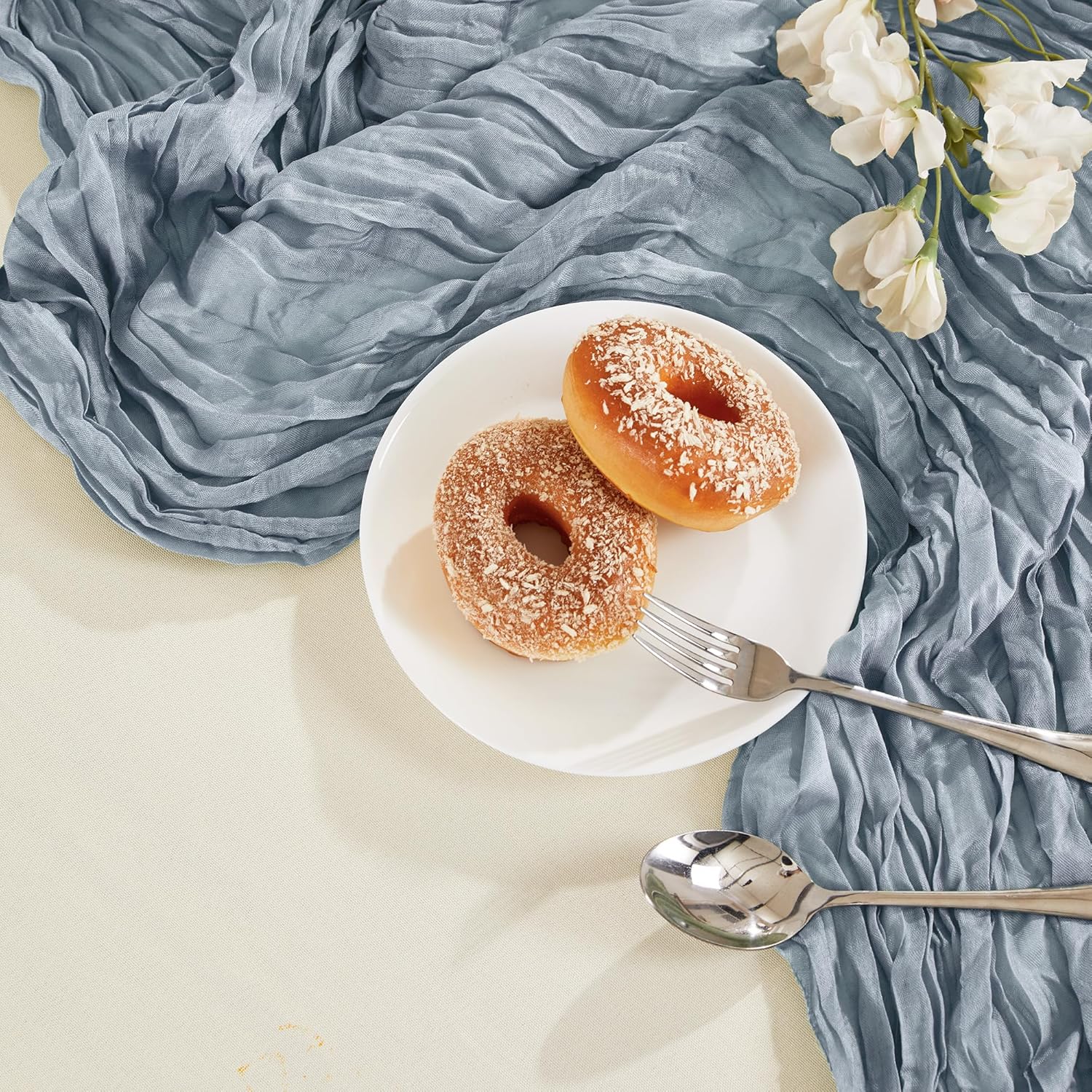 - PACKAGE INCLUDED: You will receive 24 pieces of dusty blue cheesecloth table runners. Elegant and beautiful design, exquisite workmanship. Product size: Each boho table runner is 35 x 120 inches. Enough to cover rectangles and round tables, as well as long tables that are stitched together. It can even be used to belt chairs decorate napkins, background curtains. Round or square tables for 8-10 people, perfect for romantic and elegant party events