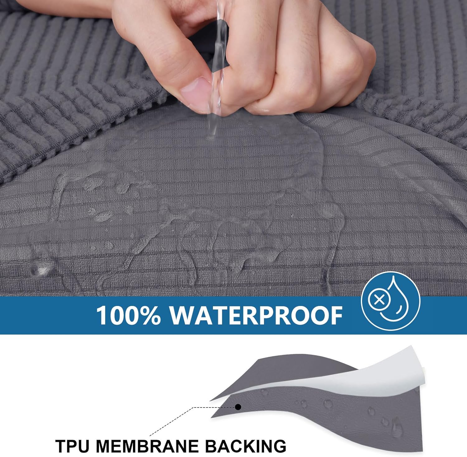 - [100% Waterproof Fabric] The back of the couch seat cover has a waterproof layer made of TPU. Great on against spills, pets' fur, stains, and normal wear and tear or any possible mess and accidents.
