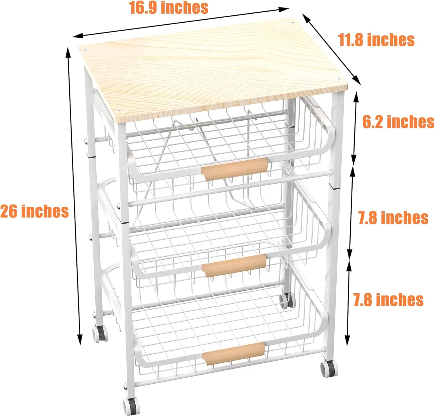 4-Layer Fruit Basket Kitchen Food Storage Organizer and Storage Rack, Stackable Storage cart with Desktop, Pull-Out Hollow Metal Storage Basket, liding Out Storage,White