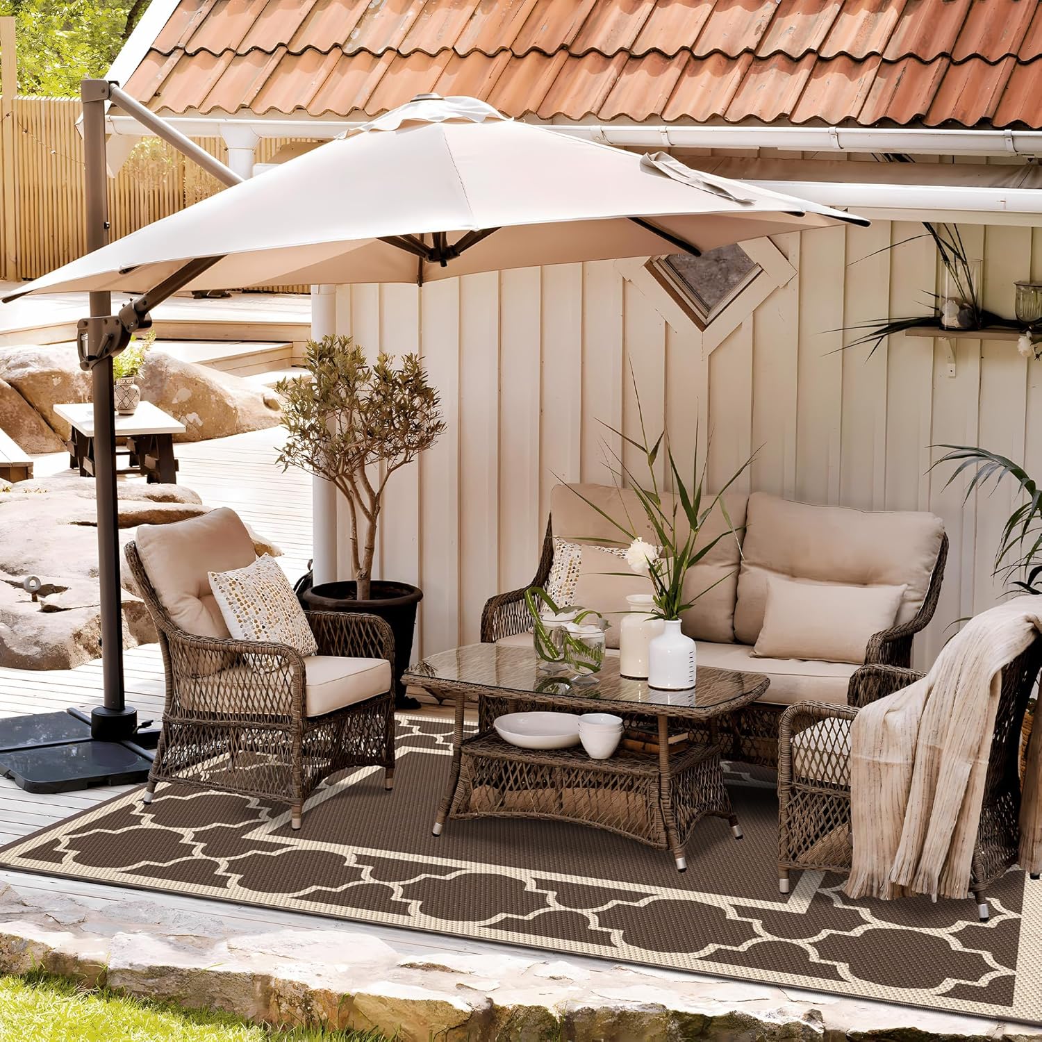 GENIMO 5' x 8' Outdoor Rug Waterproof for Patio Decor, Foldable Reversible Plastic Straw Area Rugs Mat for Camper, Outside Carpet for Rv, Deck, Porch, Picnic, Beach, Balcony, Coffee & Beige