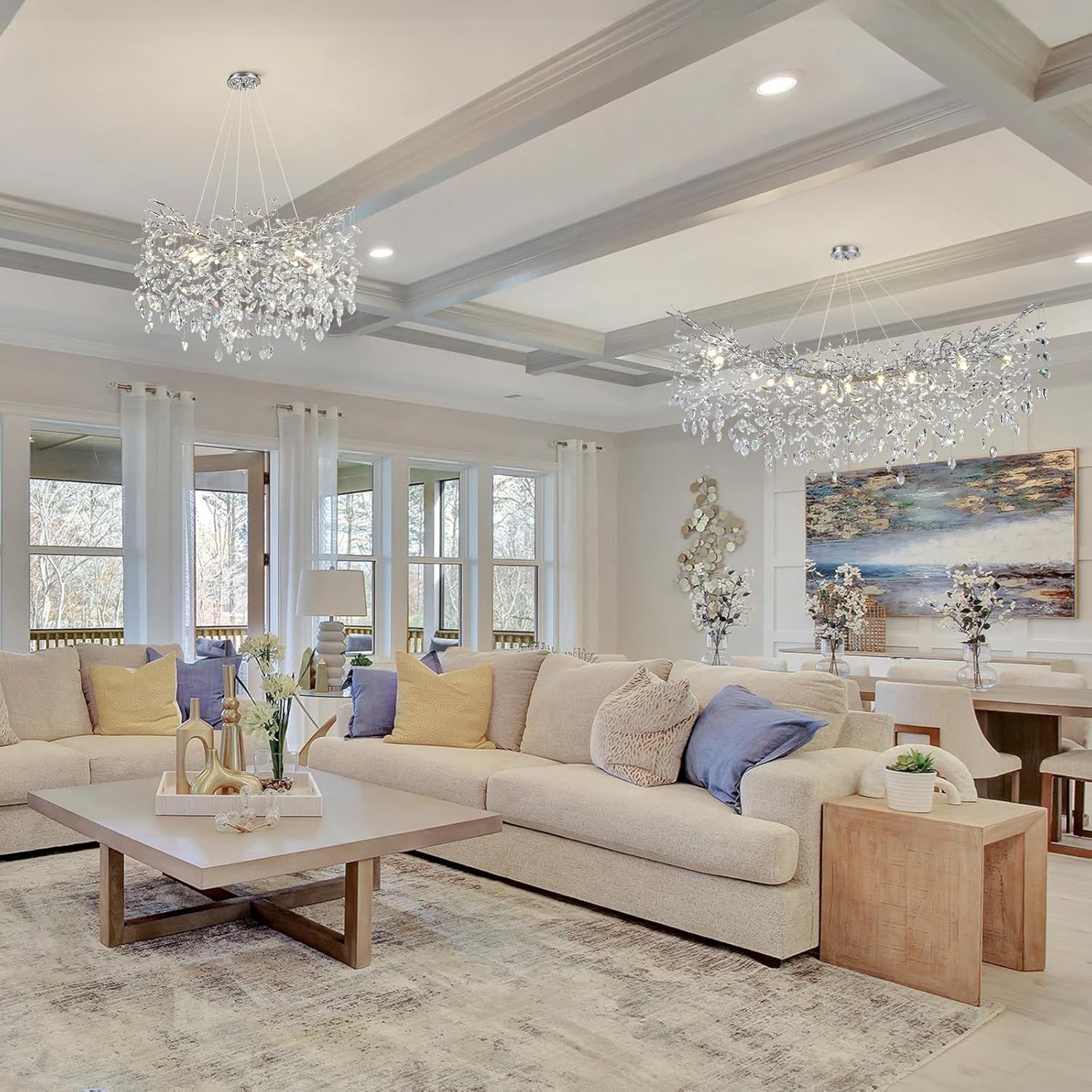 - Modern Crystal Chandelier:Transform your living space into a captivating masterpiece with our Elegant Crystal Tree Branches Chandelier. This stunning chandelier is designed to impress, featuring a unique tree branch-inspired design adorned with glistening crystals that cast a mesmerizing play of light and shadow.
