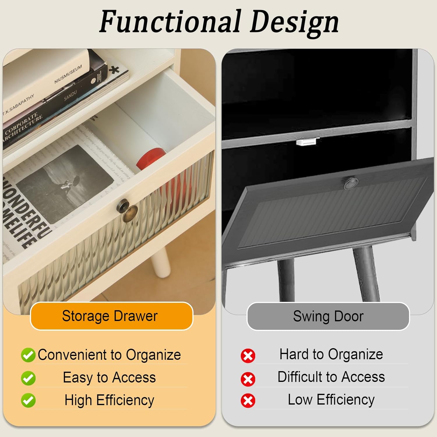 - Strudy and Reliable Structure: The modern nightstand is crafted from premium MDF with smooth and Premium coating, and four solid wood legs that strengthen the stability and durability of this nightstand, ensuring long-term use. The tabletop with edge protection designed, which can effectively prevent table items from falling