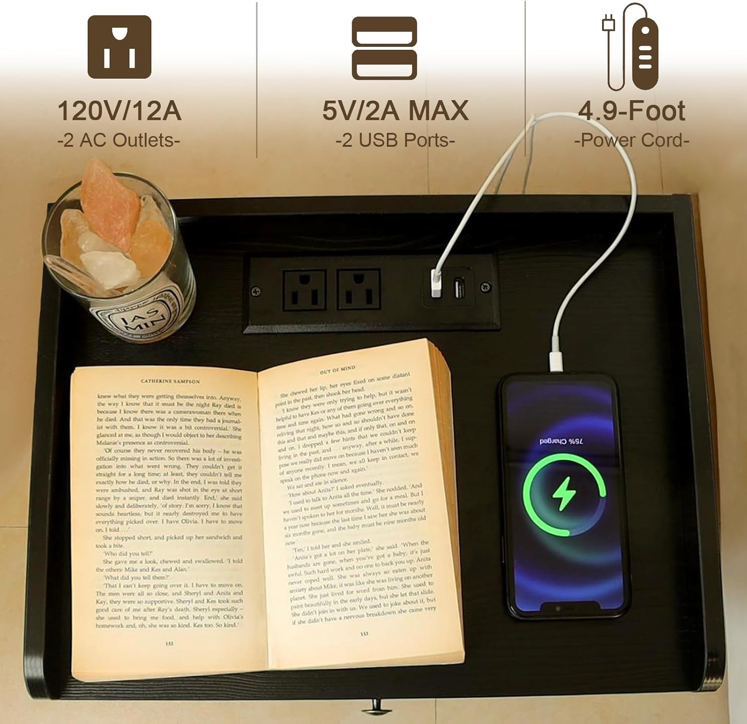 - Multifunctional Nightstand: This black nightstand with the charging station is equipped with 2 USB Ports and 2×3-Prong Power Outlets that can meet your needs to charge phones, iPads, laptops, and desk lamps easily. The 4.9-foot-long electrical cord makes phones, and ipads when charging that also is within your arm’s reach