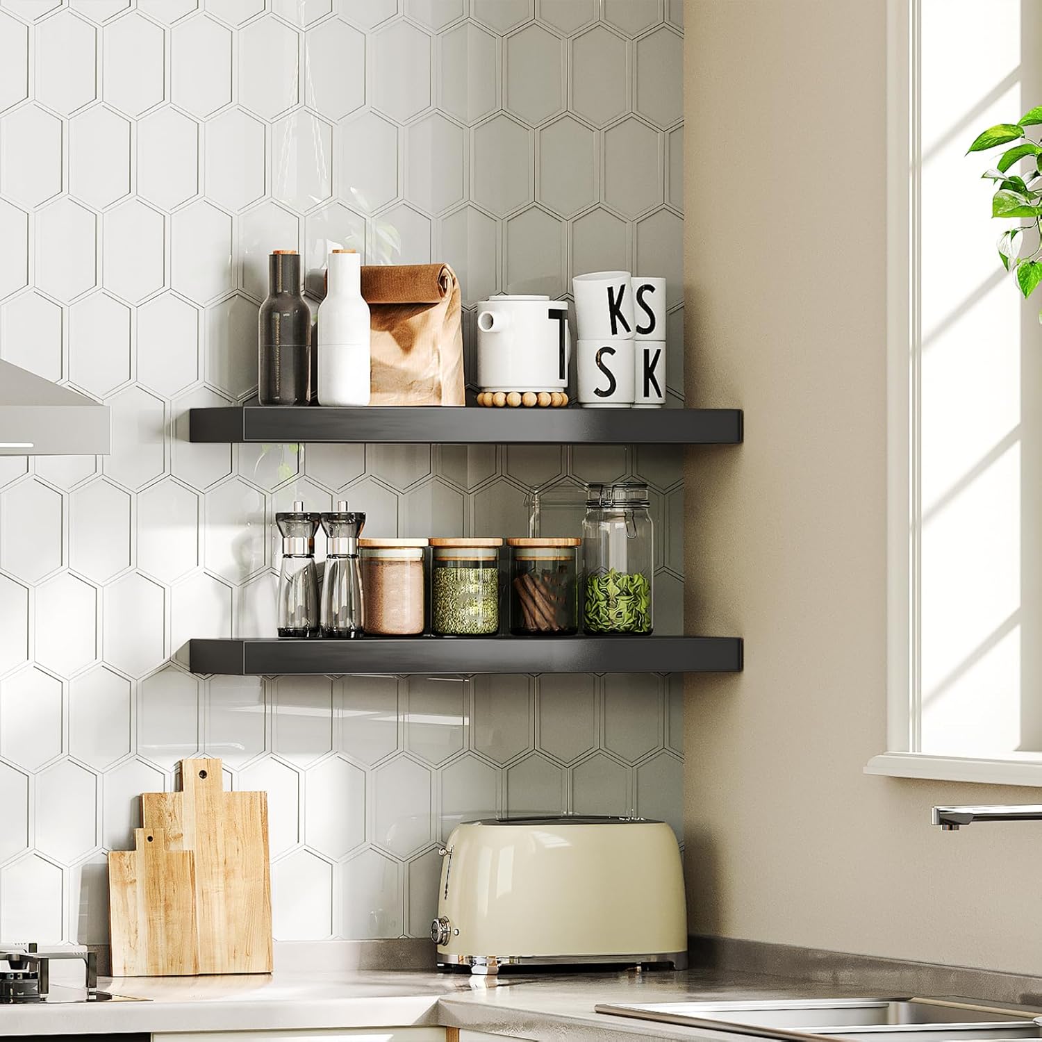 - High Quality: Sized in 23.6"L x 7.9"W x 1.5"H. The 1.5" thick floating shelves for wall are fixed with Invisible and enhanced dual-pipe iron Brackets, stable with great load up to 22 lb per wall mounted shelf