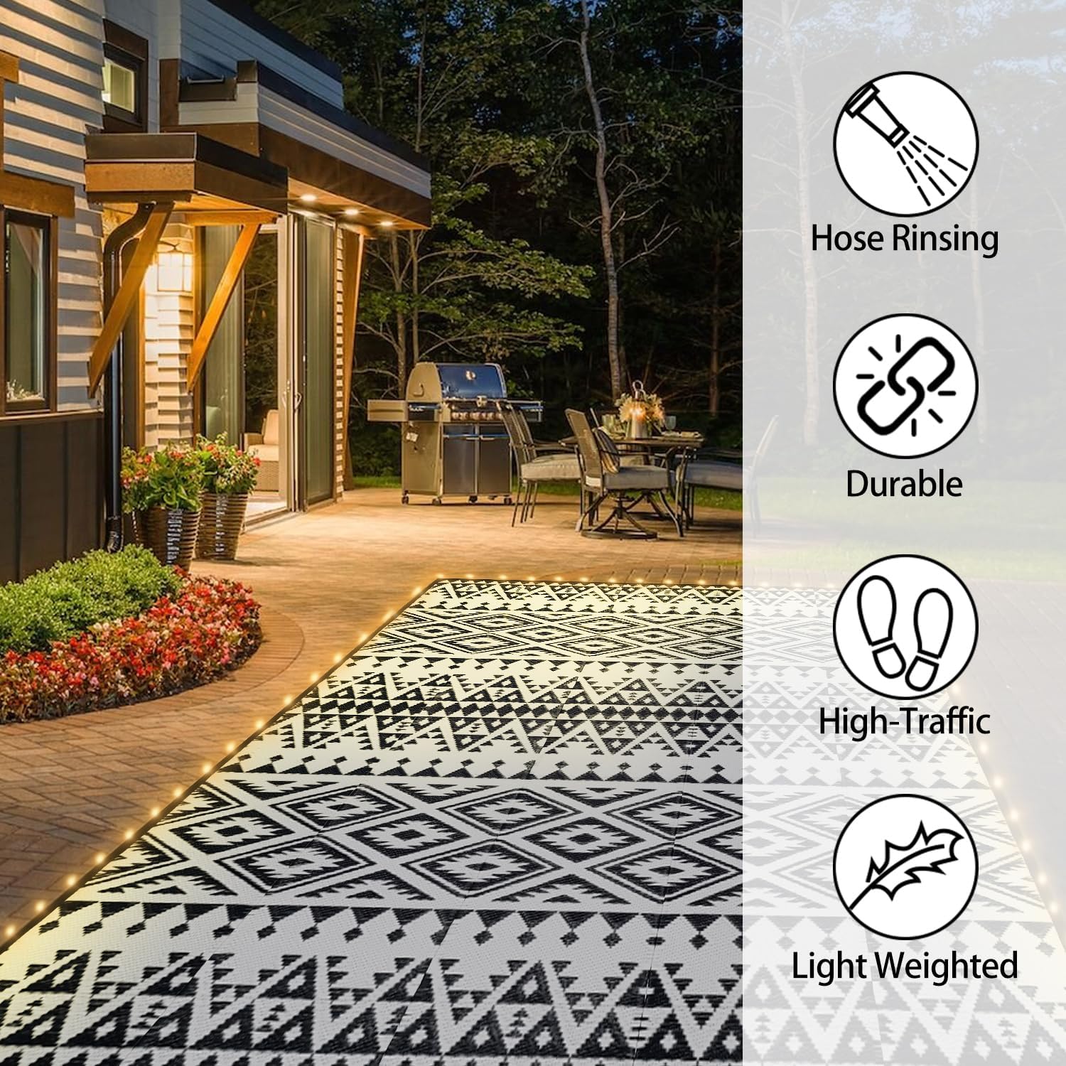 - 【EASY TO CLEAN & PORTABLE】These waterproof outdoor rugs are made of recycled plastic straw that is waterproof, stain resistant, and quick dry. You can easily clean them by spraying water or shaking off the dirt. They come with a carrying bag that can be folded into a compact size for easy storage and takeaway;