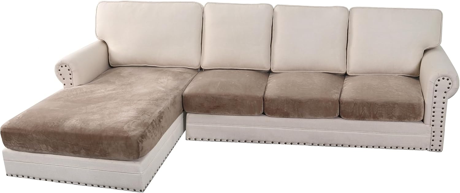 H.VERSAILTEX Velvet Stretch Sectional Couch Covers 4 Pieces Sofa Seat Cushion Covers L Shape Separate Cushion Couch Cover for Both Left/Right Sectional Couch (Large Sofa 3 Seater + 1 Chaise, Taupe)