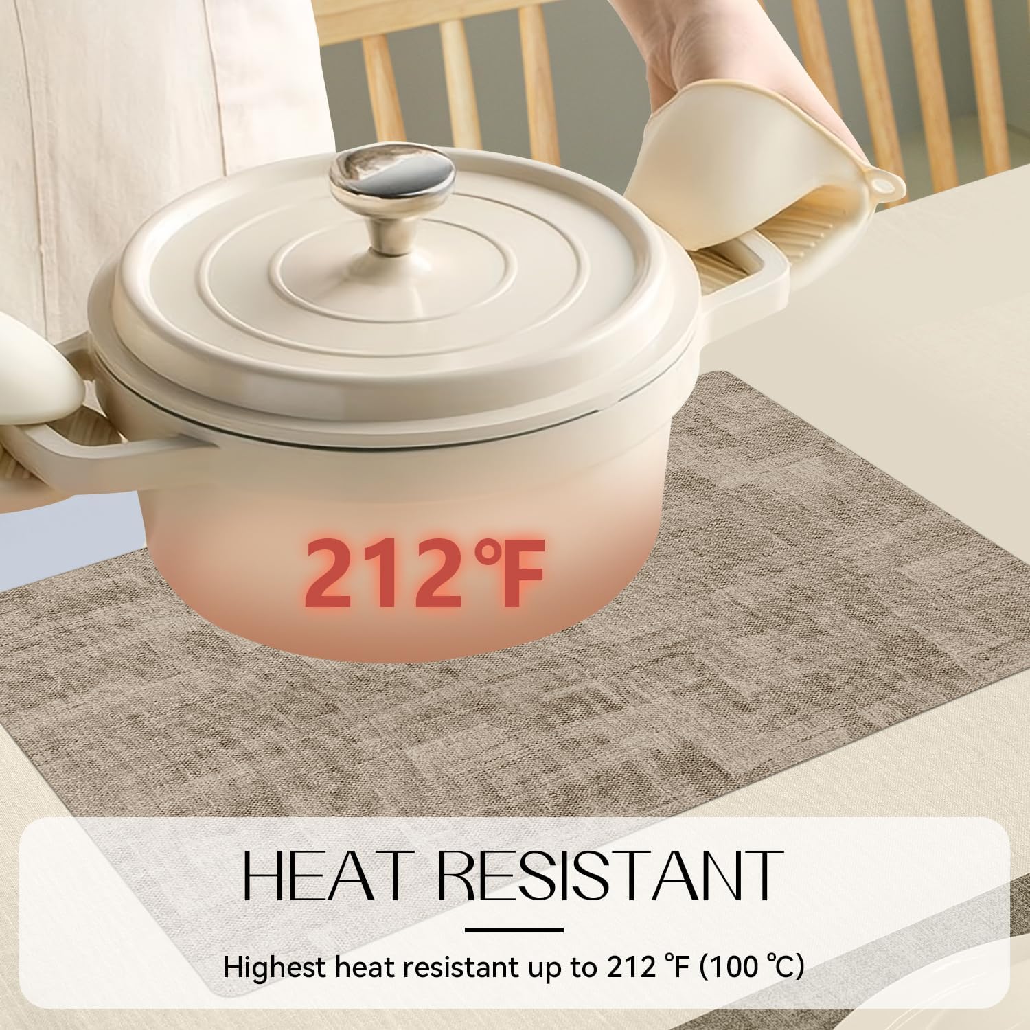 - HEAT-RESISTANT: Both sides are made of long-lasting and heat -resistant faux leather. the thickened placemats (0.12 inch/ 0.3 cm) ensure the heat won’t transfer to your cherish table. Highest heat-resistant can amount to 212 °F (100 °C), from leaving a white heat mark.