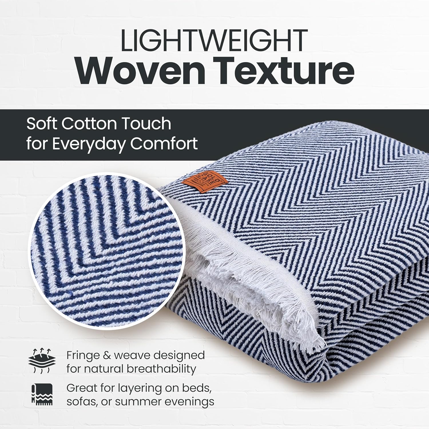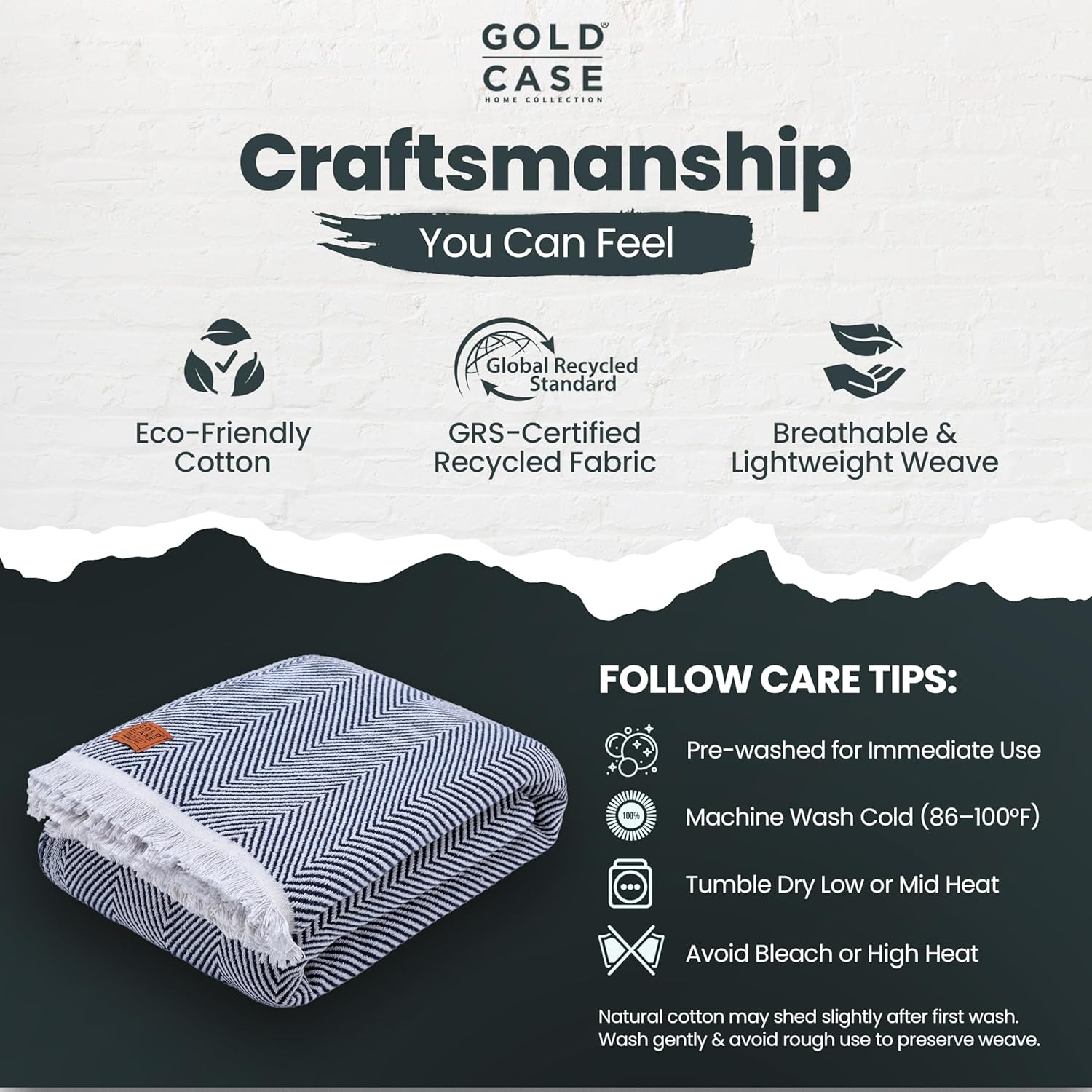 Gold Case Throw Blanket for Bed – 100% Recycled Turkish Cotton Bed Blanket – Decorative Throw Cotton Blankets for Living Room & Bedroom – Woven Twin Blankets - 71x90 - Navy Blue