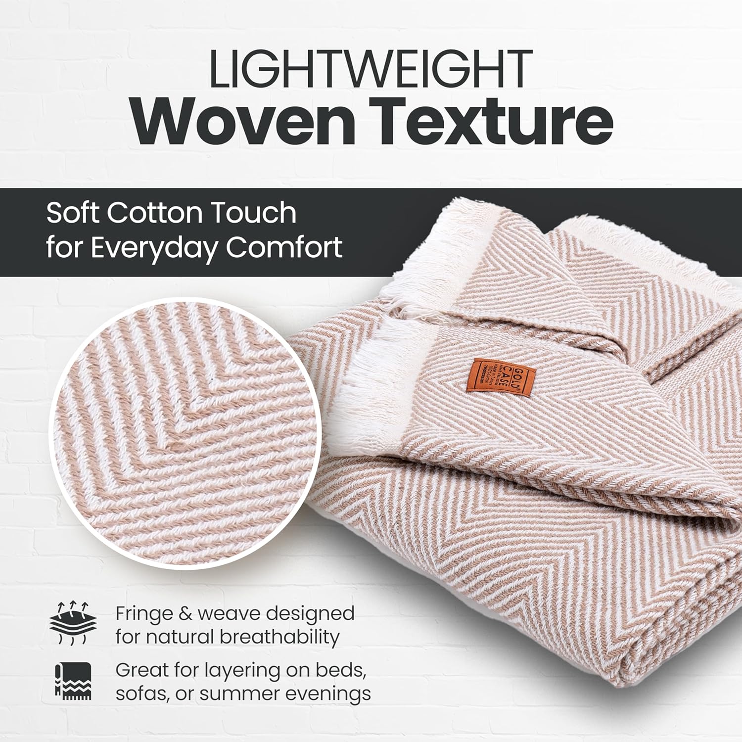 Gold Case Throw Blanket for Couch – 100% Recycled Turkish Cotton Blankets & Throws – Elegant Decorative Throw Blankets for Living Room Sofa – Woven Throws for Couch – Elegant Beige – 50x60