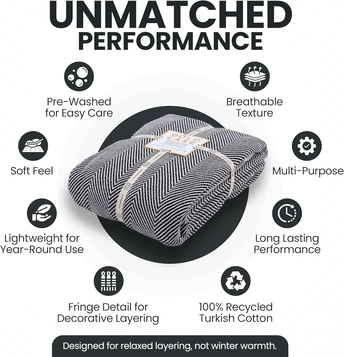 Gold Case Throw Blanket for Bed – 100% Recycled Turkish Cotton Bed Blanket – Decorative Throw Cotton Blankets for Living Room & Bedroom – Elegant Black Woven Queen Blankets – 90x90