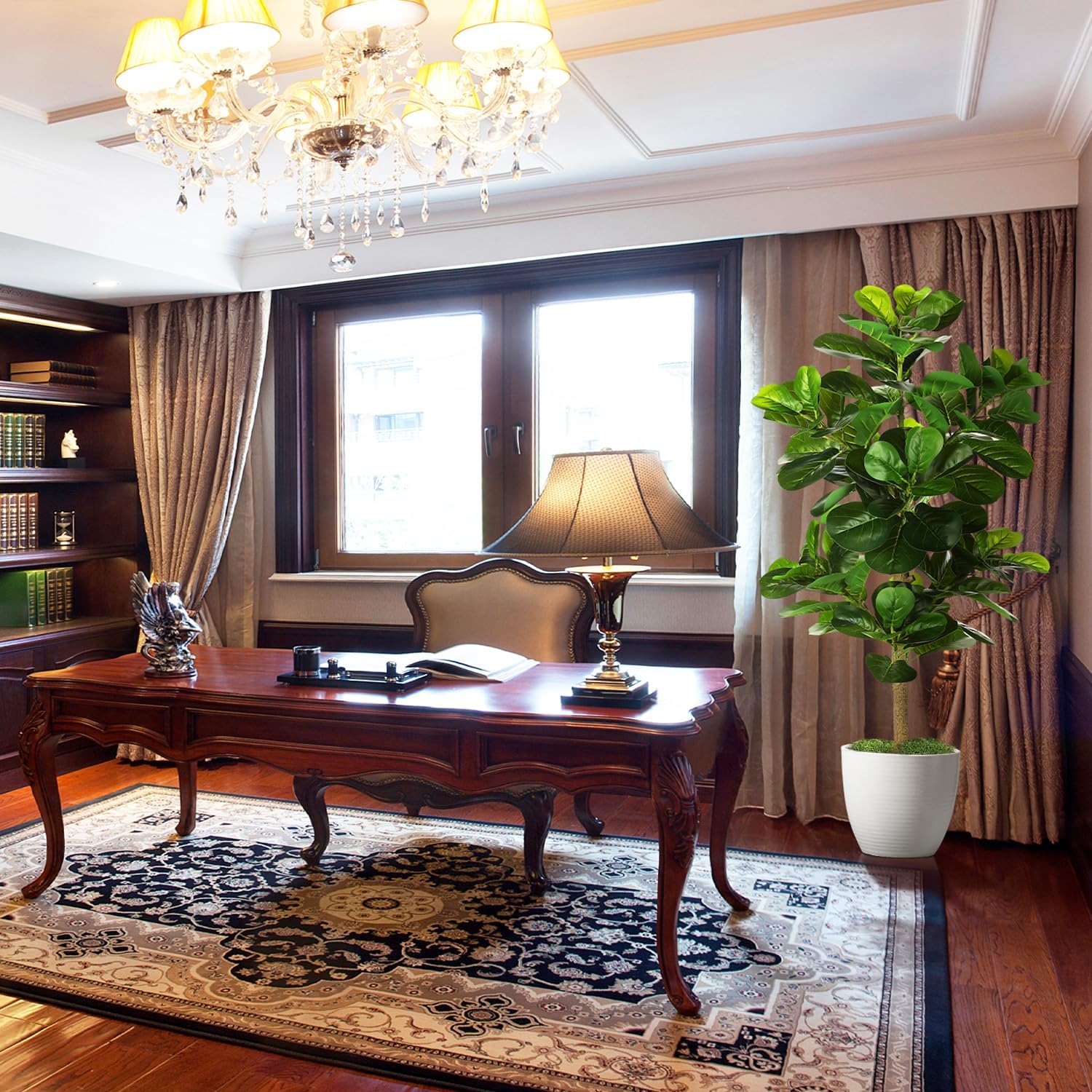 - 【BEST DECORATIONS】 Carefully crafted to mimic the appearance of a real-life Fiddle Leaf Fig Tree, looking as close to reality as possible, perfect for any room or office and outdoor decor, this fake fig tree will let you feel the presence of nature. All seasons are green. Perfect housewarming gift.