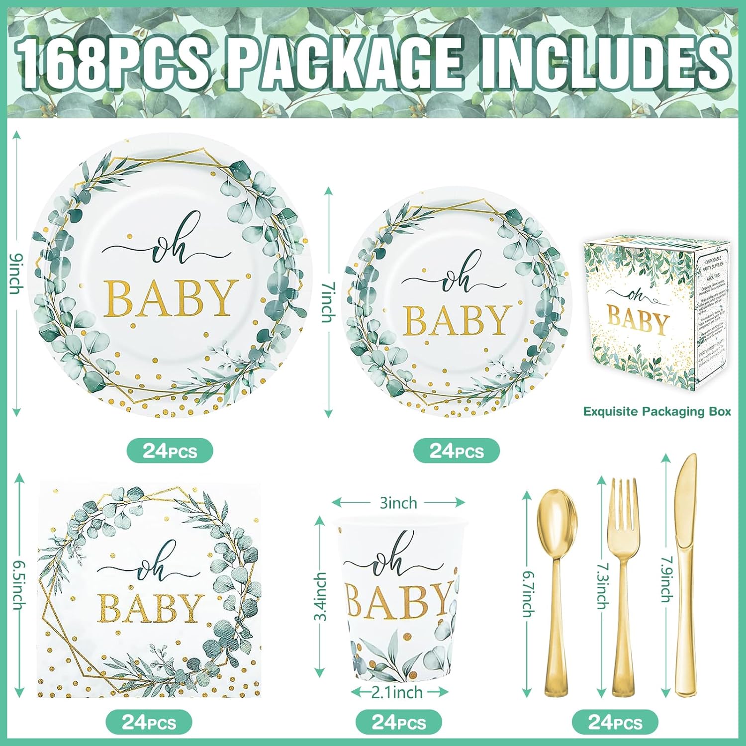 - 【Baby Boy Shower Decorations】- Oh baby baby shower decorations include 24 9 inch baby boy shower plates, 24 7-inch sage green baby shower plates, 24 baby shower cups, 24 baby shower napkins, 24 sets of plastic utensils (forks, spoons, knives), 168 pieces in total.