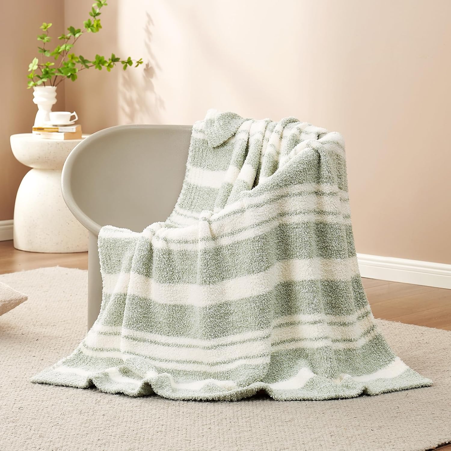 Snuggle Sac Stripe Sage Green Throw Blanket for Couch, Super Soft Warm Blankets Cozy Knit Fuzzy Plush Lightweight Throws for Sofa, Bed,Living Room, Stripe Green, 50x60 inches