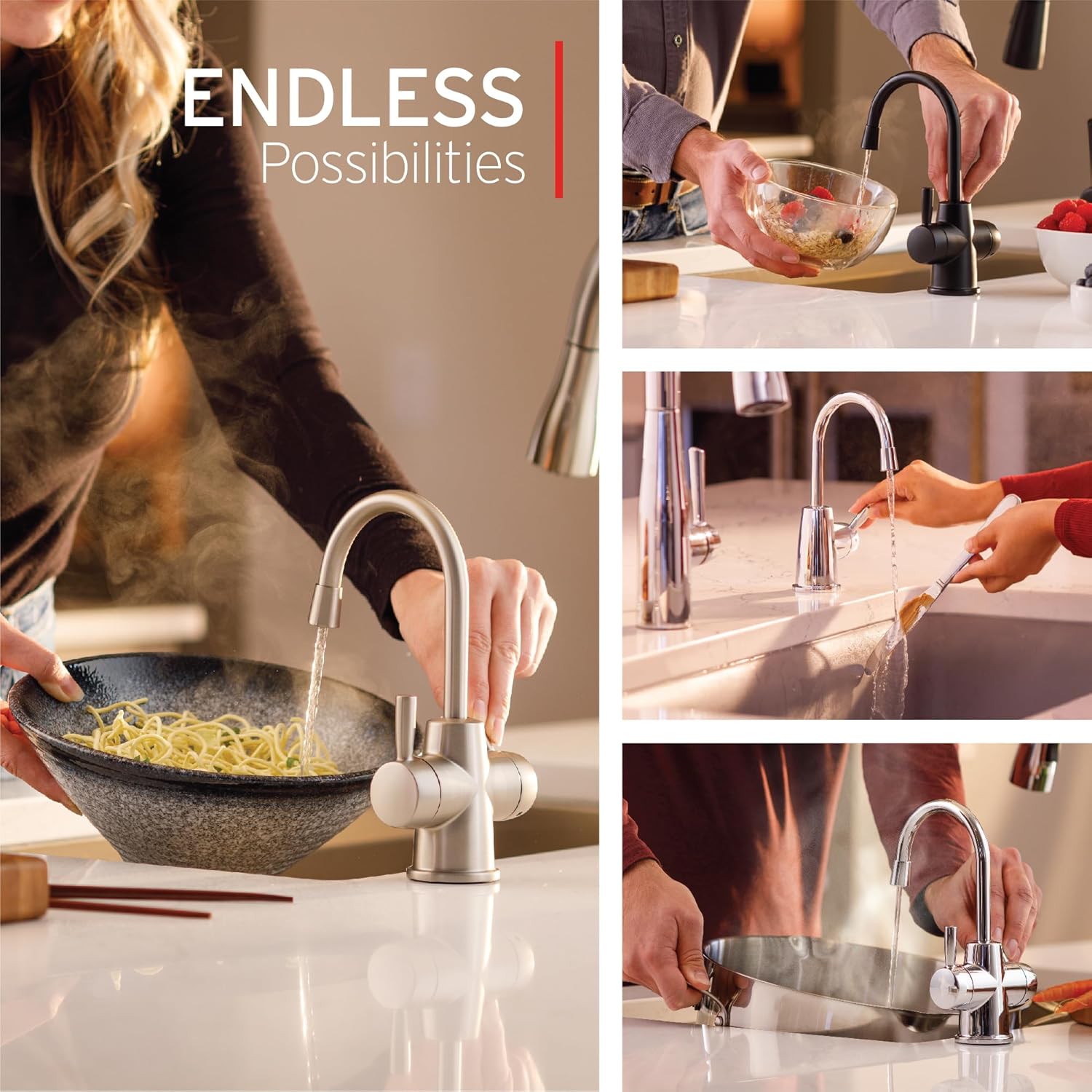 - Product 1: ON-DEMAND, NEAR-BOILING WATER: Instant hot water (approximately 200 degrees F) right next to the main kitchen faucet when you need it, for cooking, cleaning, and more; a time, space, and energy saver that lets you get on with more important things in life