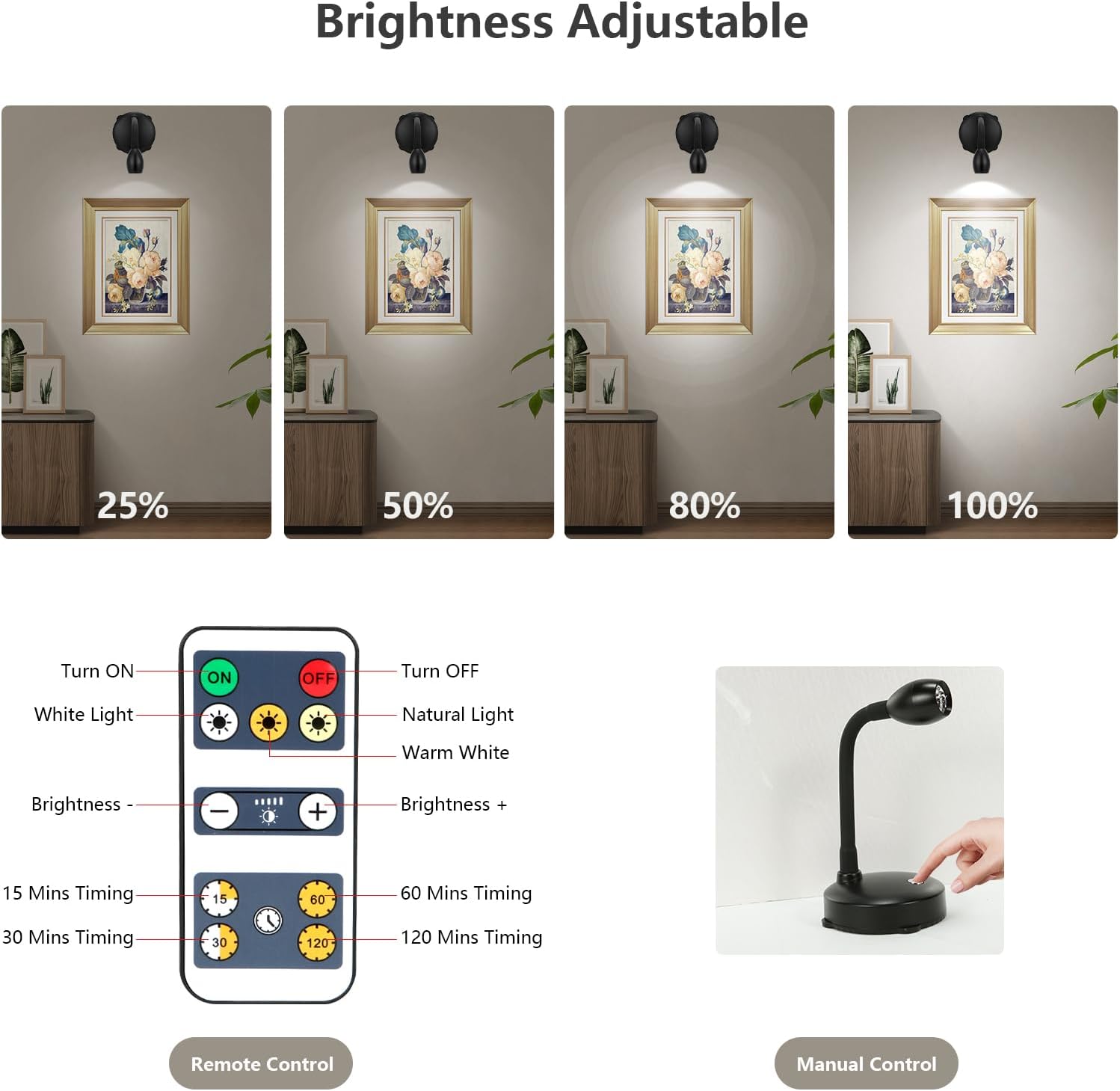 - [Adjustable Brightness] - The small spotlight has a long lasting super bright LED, 80 Lumens, you can press 10%, 40%, 80% or 100% directly, or press the "+" or "-" button on the remote to adjust the brightness level as you wish.