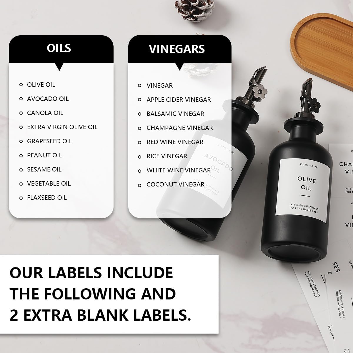 • KITCHEN ESSENTIAL - Worthy of sitting on your kitchen counter, The olive oil bottle dispenser for kitchen with label which can help you identify them easily, both decorative and practical, this oil dispenser bottles not only kitchen oil dispenser, but also black and white kitchen décor.